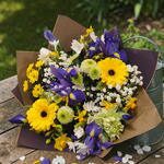 Яркий букет ручной работы, представляющий собой прекрасное сочетание желтых, фиолетовых и белых цветов, искусно дополненных свежей сезонной зеленью. Яркий, но элегантный, этот жизнерадостный букет передает радость весны и станет потрясающим подарком для мамы на День матери. 💛💜🤍🌿