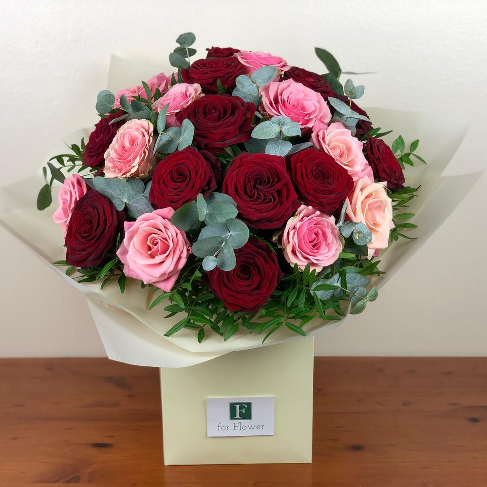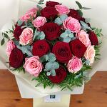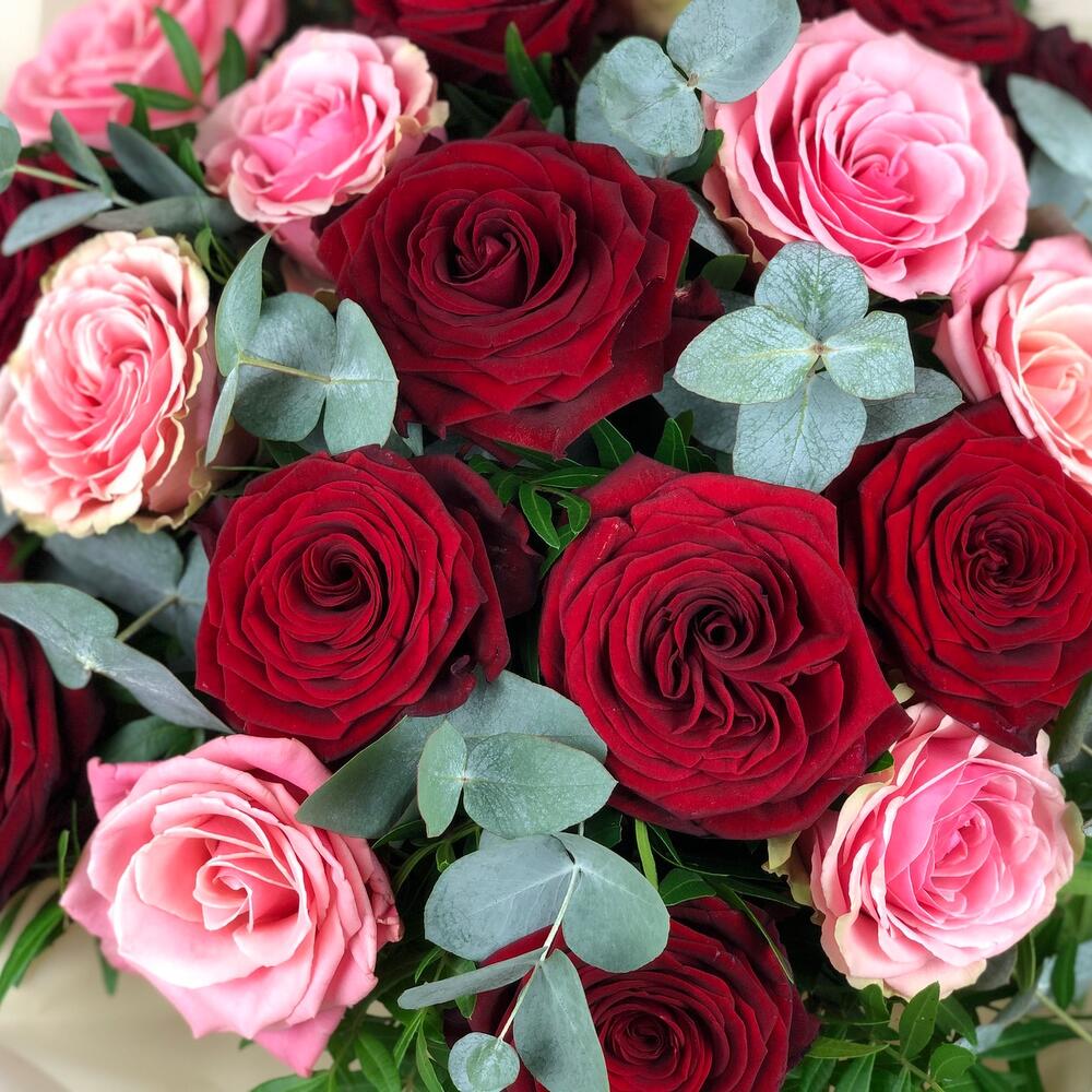 Этот букет цветов — смесь красных и светло-розовых роз в сочетании с эвкалиптом. Немного истории: Символика розы зависит от её цвета и от того, сколько роз дарят. Красные розы символизируют любовь и романтику и являются идеальным выбором на День святого Валентина. Розовые розы символизируют благодарность, изящество, восхищение и радость. Представьте, как они сочетаются.