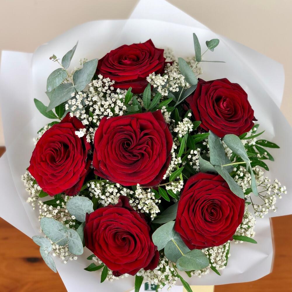 Этот букет цветов — смесь роскошных красных роз сорта Наоми в сочетании с гипсофилой и эвкалиптом. Немного истории: красные розы обычно считаются идеальным подарком на День святого Валентина и имеют стильный и элегантный вид, который делает их классическим символом «Я люблю тебя». Значение красных роз повсеместно понимается как любовь и страсть.