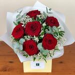 Red rose - 6 шт. Eucalyptus - 2 шт. Box - 1 шт. белая гипсофила - 2 шт.
