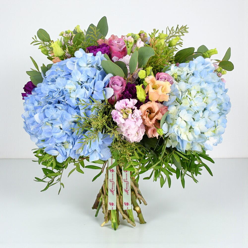 Классический букет Moyses с голубыми гортензиями, великолепными дымчатыми розами, стоксами, гвоздиками, сезонной зеленью.