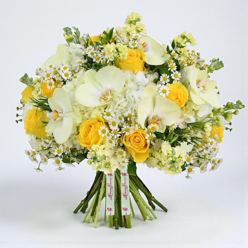 Независимо от того, называете ли вы это ромашкой или маргариткой, нельзя не согласиться с изящной красотой этого цветка. Собранные детьми и сделанные в венки, наши флористы решили превратить их в этот нежный и элегантный букет. С орхидеями фаленопсис, украшенными на фоне белых гортензий и разбросанными желтыми розами. Всё завершено сезонной зеленью. Эта композиция понравится всем и подходит для любого случая.