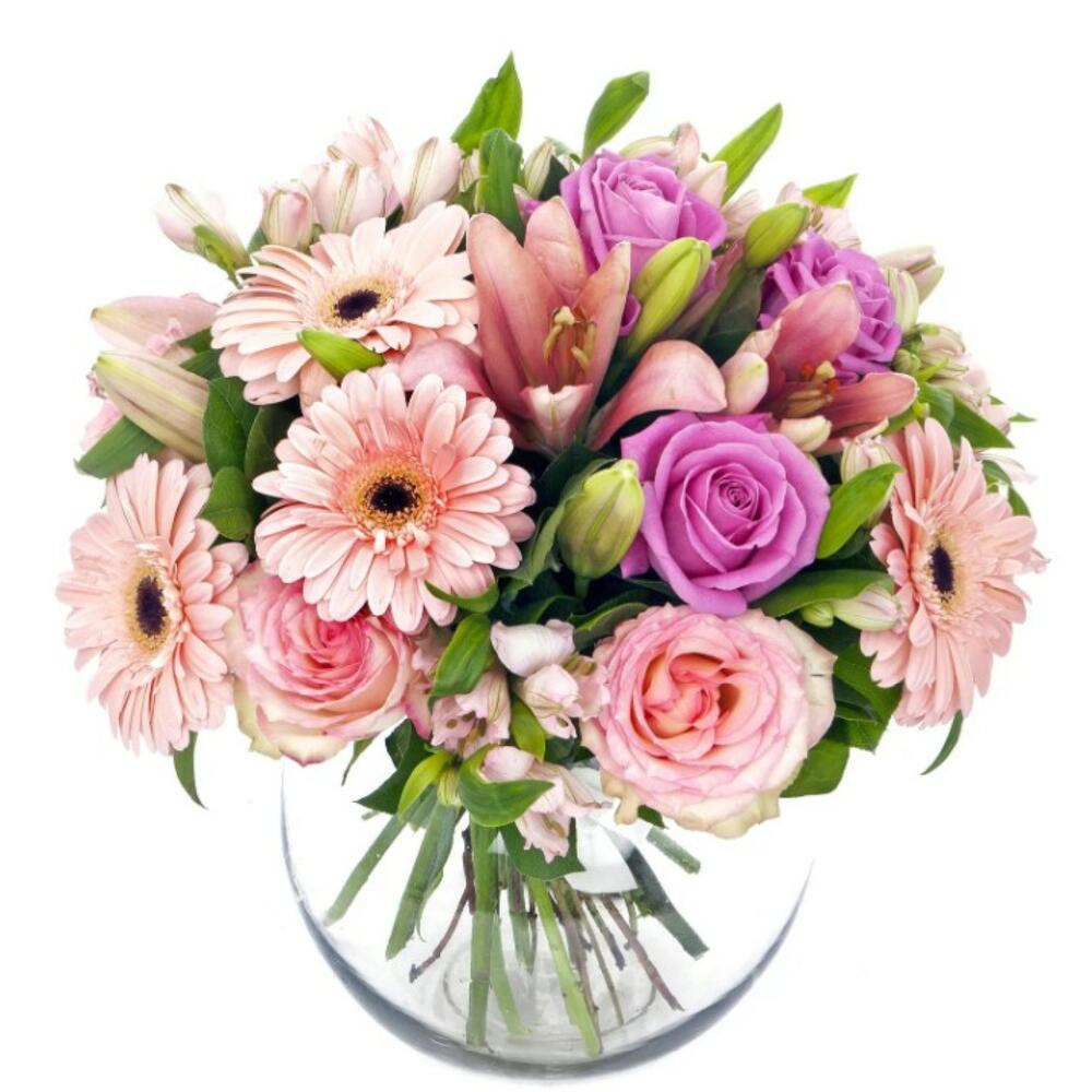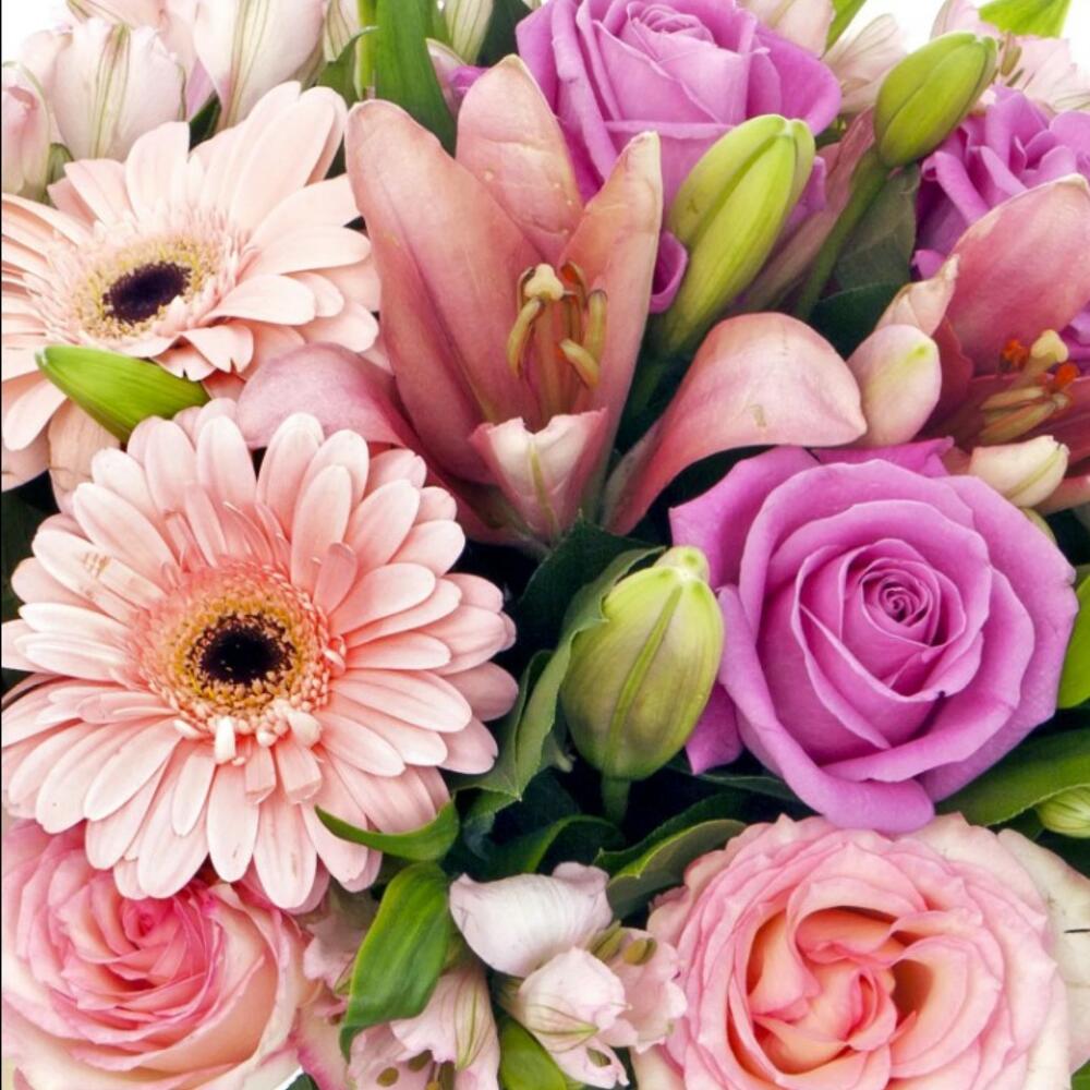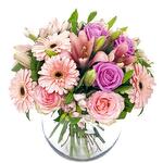 Alstroemeria - 5 шт. Gerbera - 5 шт. Lilies - 3 шт. aqua rose - 5 шт. мягкая розовая роза - 5 шт. сезонная листва - 9 шт.