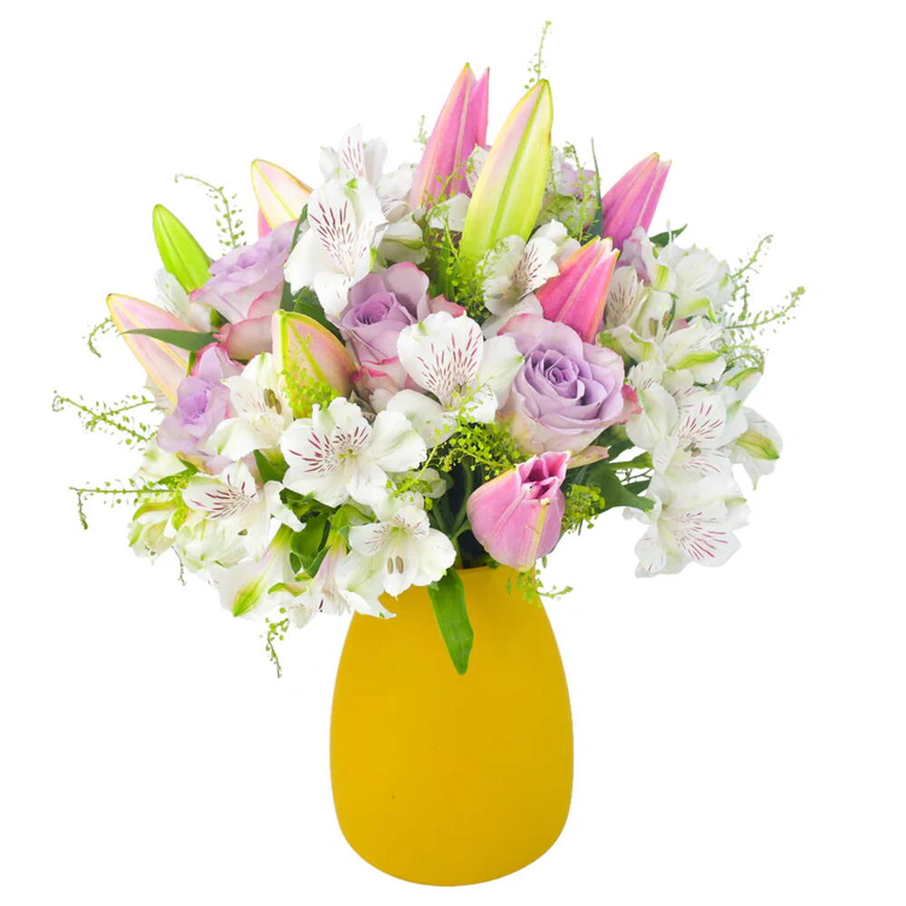 Великолепная пастельная композиция с лилиями, розами, альстромериями нежными стебельками зелёных колокольчиков. *Ваза не включена