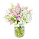 Alstroemeria - 5 шт. White lilies - 4 шт. сиреневые розы - 5 шт. сезонная листва (пучок) - 1 шт.