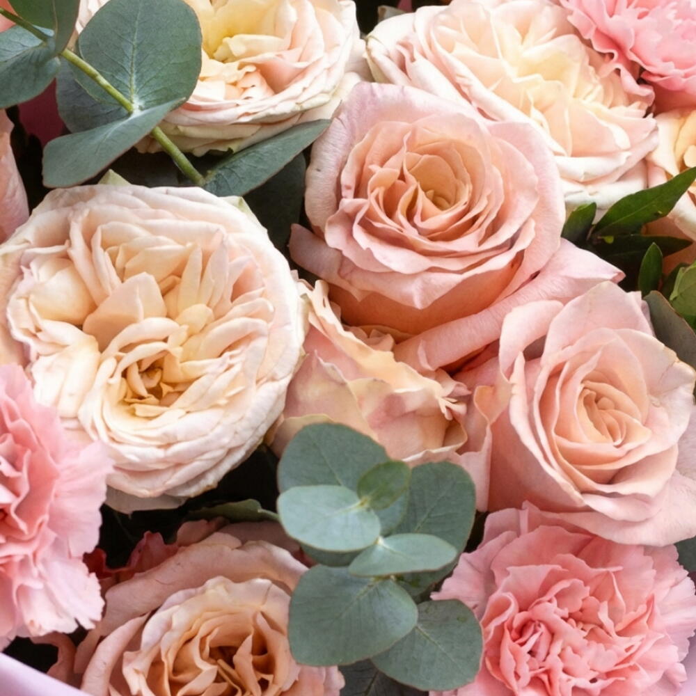 Eucalyptus - 3 шт. Spray rose - 2 шт. peach rose - 5 шт. pastiche - 3 шт. pink diantus - 5 шт.
