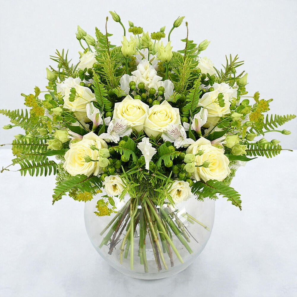 Элегантность и изящество воплощают этот пикантный цветочный букет. Белые розы и лизиантусы переплетаются с богатой зеленью, создавая атмосферу английского загородного сада. Альстромерия и коровья петрушка в сочетании с зелеными ягодами зверобоя создают яркую композицию. Изысканную композицию дополняют пышный папоротник-мечник, володушка и розмарин.