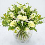 Элегантность и изящество воплощают этот пикантный цветочный букет. Белые розы и лизиантусы переплетаются с богатой зеленью, создавая атмосферу английского загородного сада. Альстромерия и коровья петрушка в сочетании с зелеными ягодами зверобоя создают яркую композицию. Изысканную композицию дополняют пышный папоротник-мечник, володушка и розмарин.