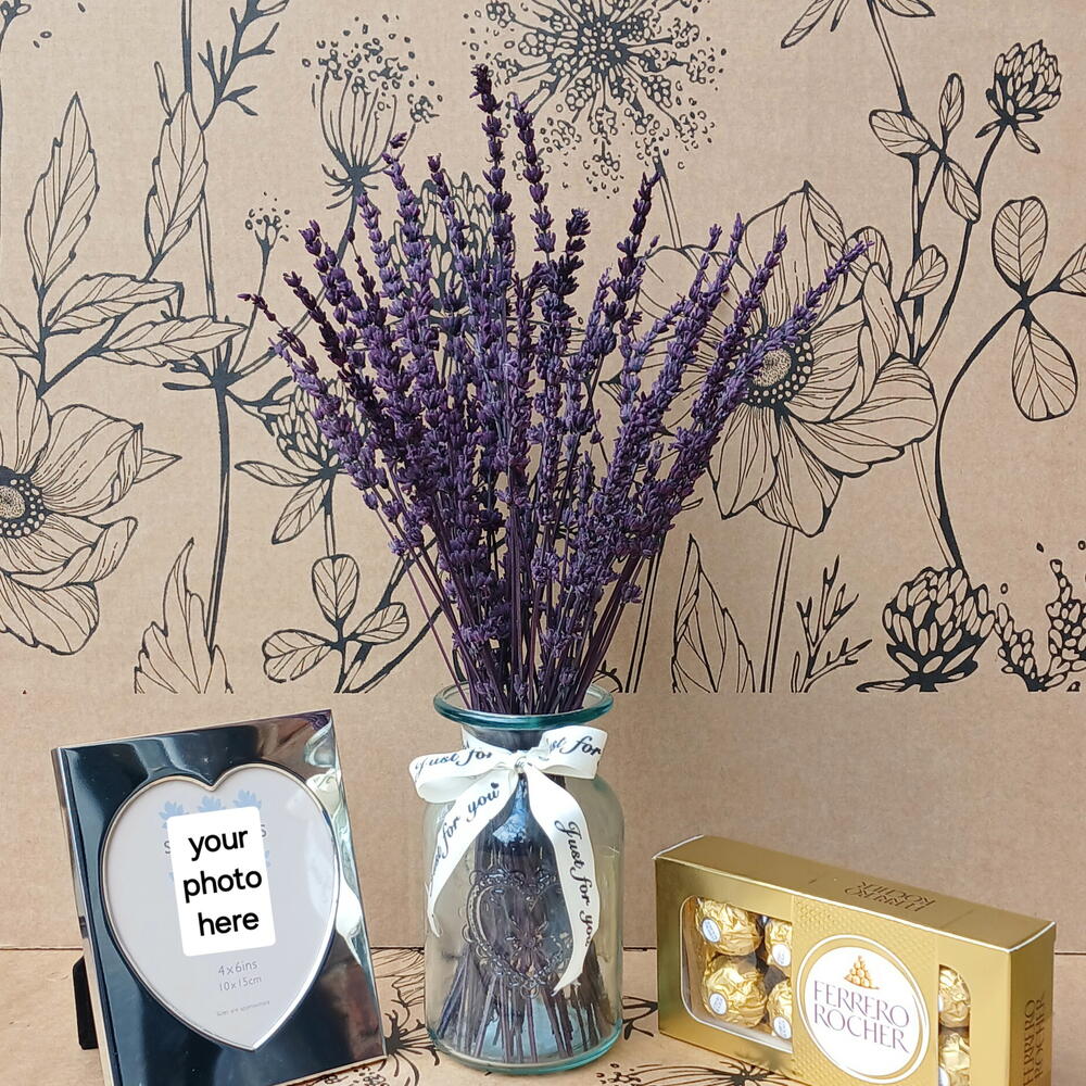 коробка шоколадных конфет - 1 шт. открытка с сообщением - 1 шт. silver plated picture frame 4x6inch - 1 шт. vase dried lavender - 1 шт.