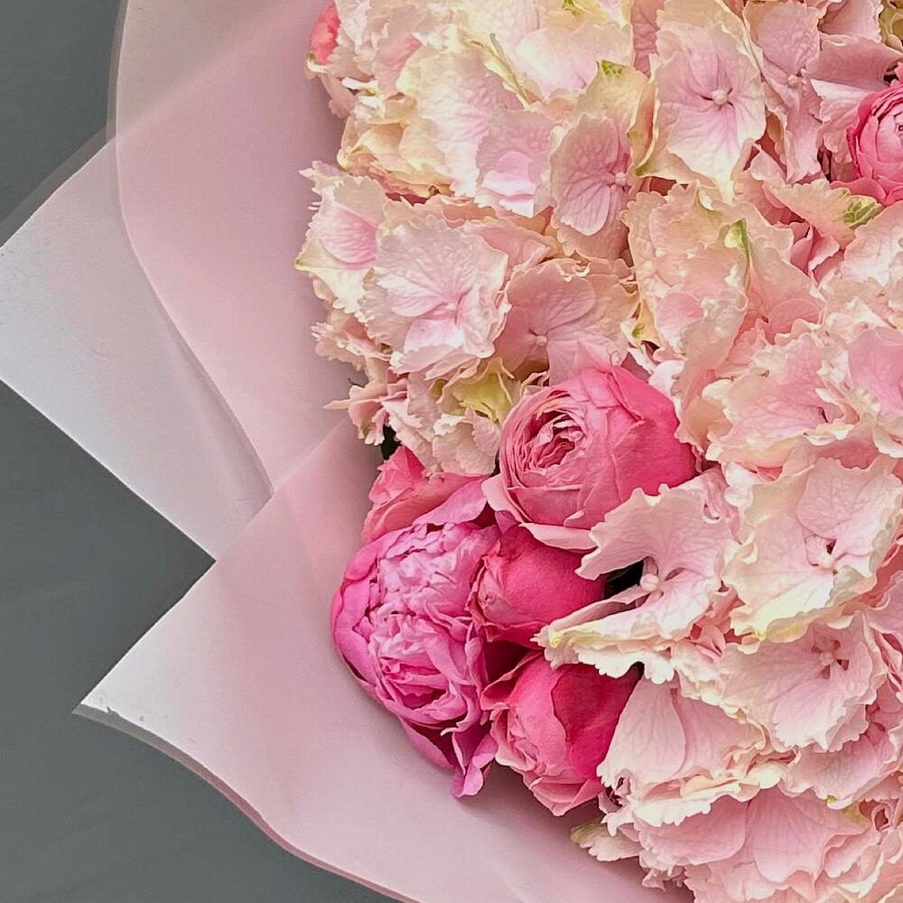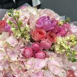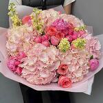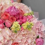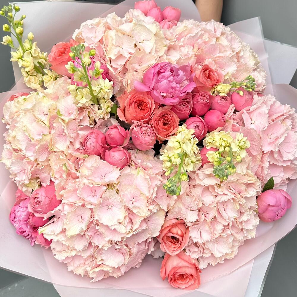 Pink bouquet with hydrangeas (peony roses, matiola, spray roses, roses, hydrangeas )