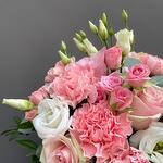 Beautiful flower arrangement in a box with pink carnations and roses will not leave anyone dissappointed! Еach order comes with an aqua bag and flower food Please care for your flowers by cutting off stems with a sharp knife or scissors. By placing them in deep water prior to arranging in a clean container, having removed any foliage which would be below water level. Avoid putting flowers in direct sunlight, draughts or hot locations. Always use flower food provided. Roses: as above. If the roses wilt, re-cut and plunge stems in 2” of boiling after for 1 minute then plunge into deep water. Flower arrangement: add some water daily to the foam of the arrangement