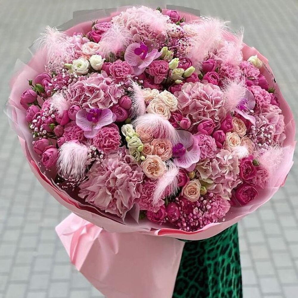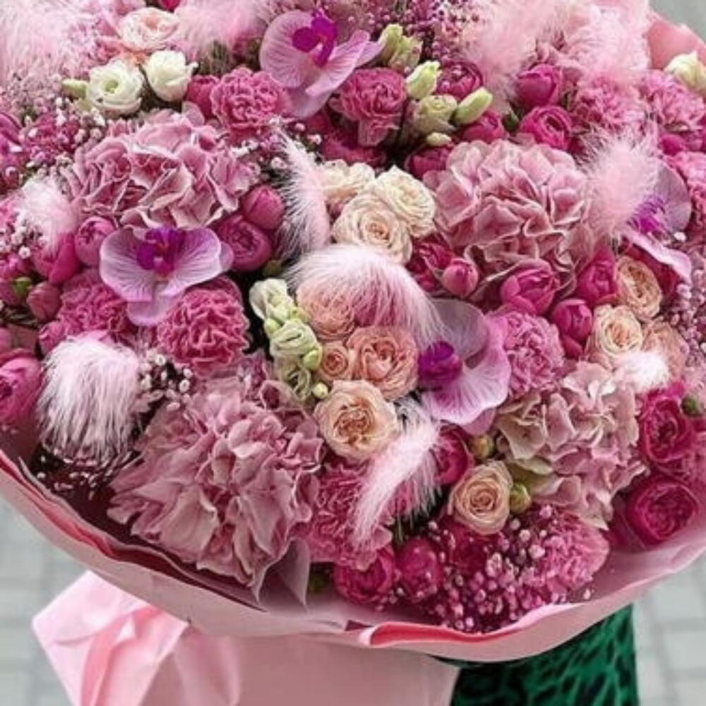 Spray rose - 10 шт. Lisianthus - 10 шт. Orchid - 5 шт. hydrangea pink - 10 шт. gypsophila flower - 5 шт.