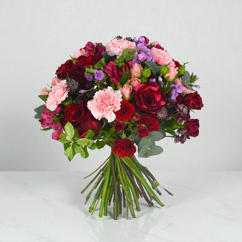 Погрузитесь в роскошные оттенки наших роз премиум-класса, кустовых роз и эффектной астранции. В этом роскошном букете их дополняет изысканная зелень, подобранная нашими флористами для придания композиции яркости и фактуры.