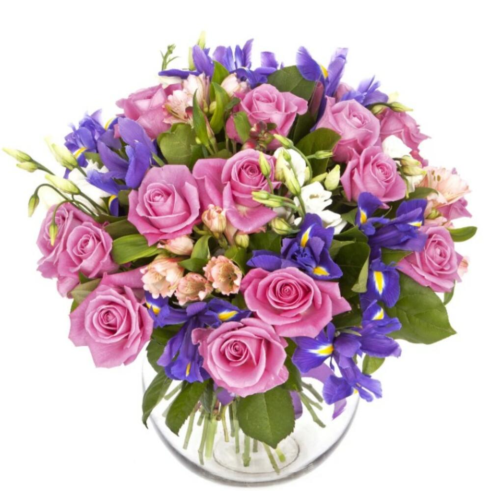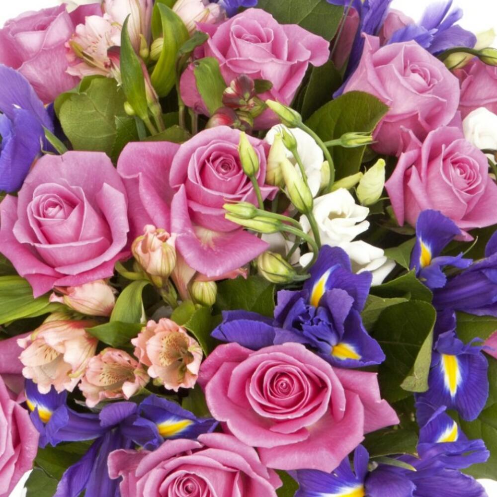 Alstroemeria - 5 шт. розовая аква-роза - 15 шт. сезонная листва - 7 шт. голубые ирисы "синий бриллиант" - 10 шт. лизиантус мариачи - 5 шт.
