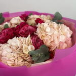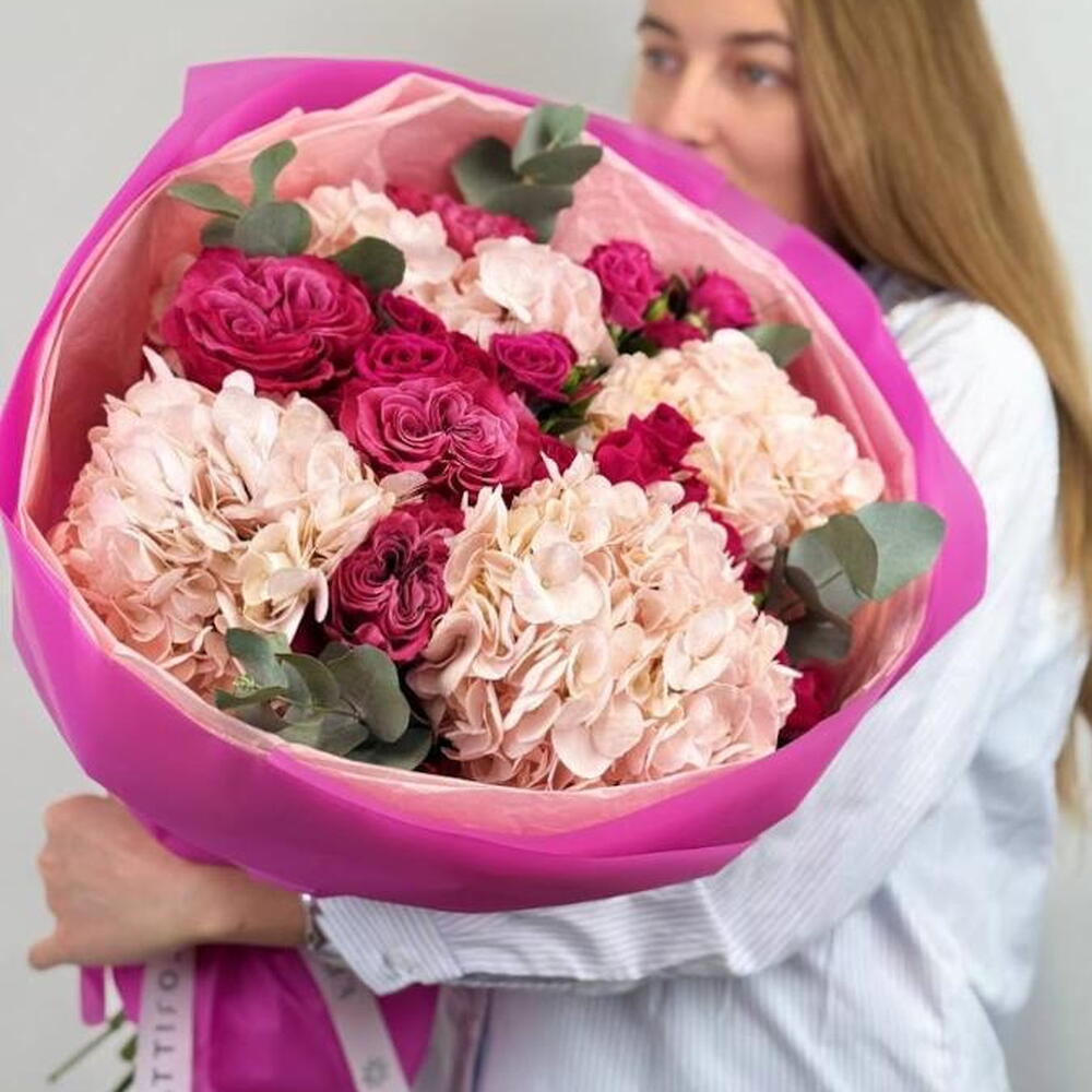 A vibrant bouquet of deep magenta and soft blush roses paired with delicate hydrangeas, wrapped in bold pink paper. A striking expression of passion and elegance.