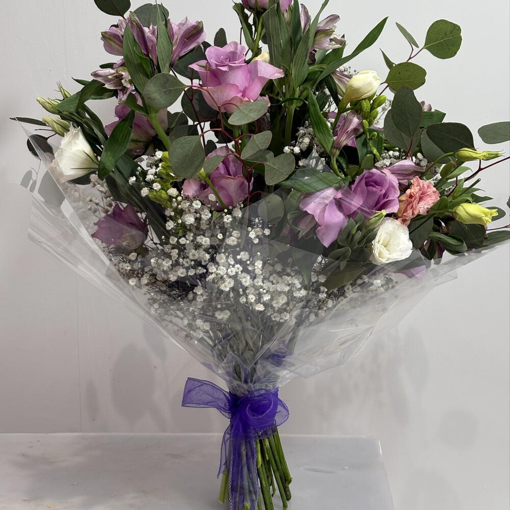 Alstroemeria - 4 шт. Gypsophila - 5 шт. mixed foliage - 4 шт. roses - 10 шт. смешанные лизиантусы - 5 шт.