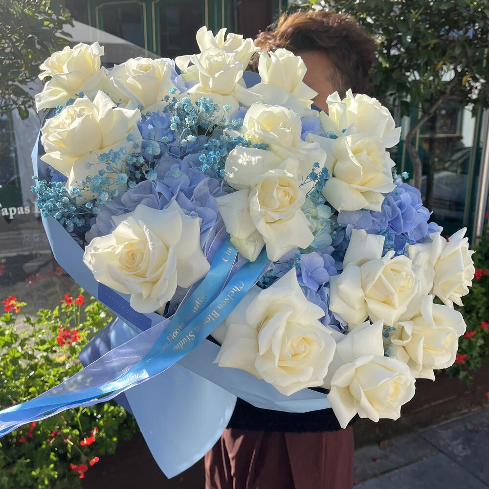 Gypsophila - 5 шт. hydrangeas blue - 5 шт. roses white - 15 шт.