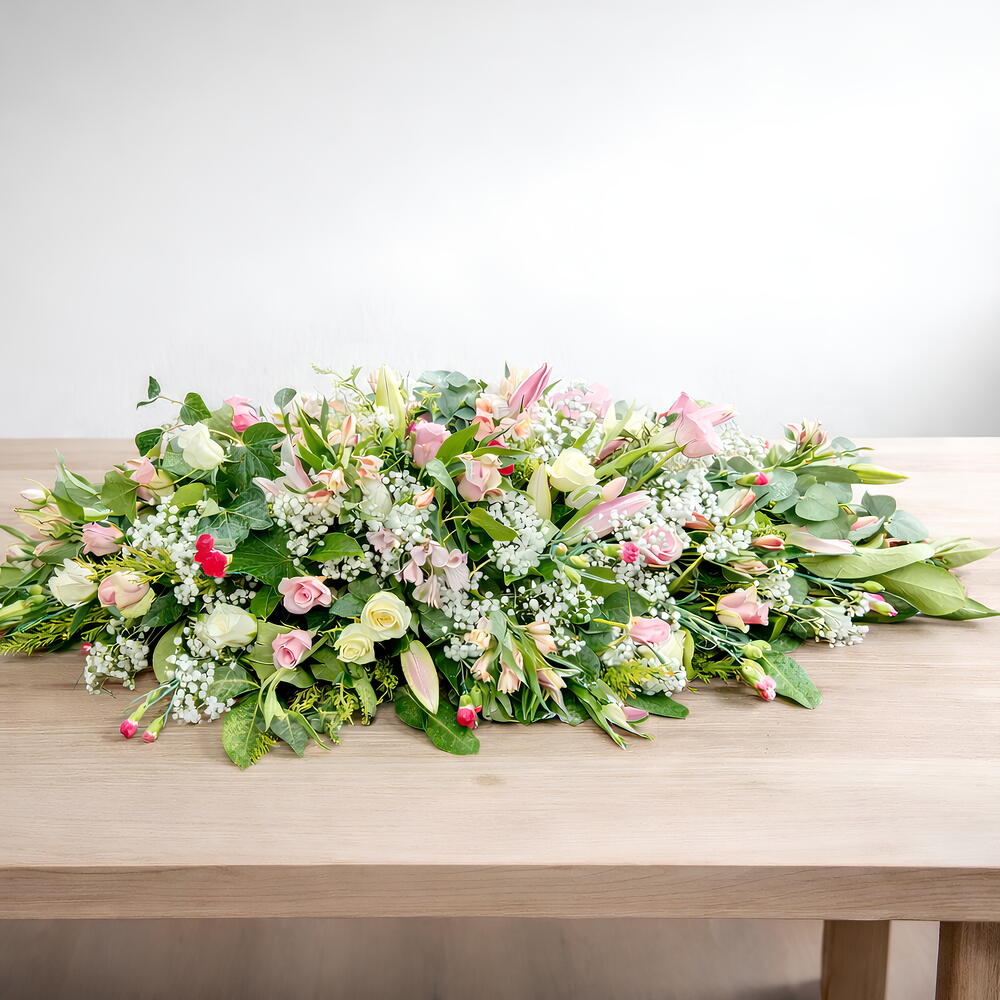 Композиция для гроба в оттенках розового и белого, включающая розы и лилии. Длина 4-5 футов