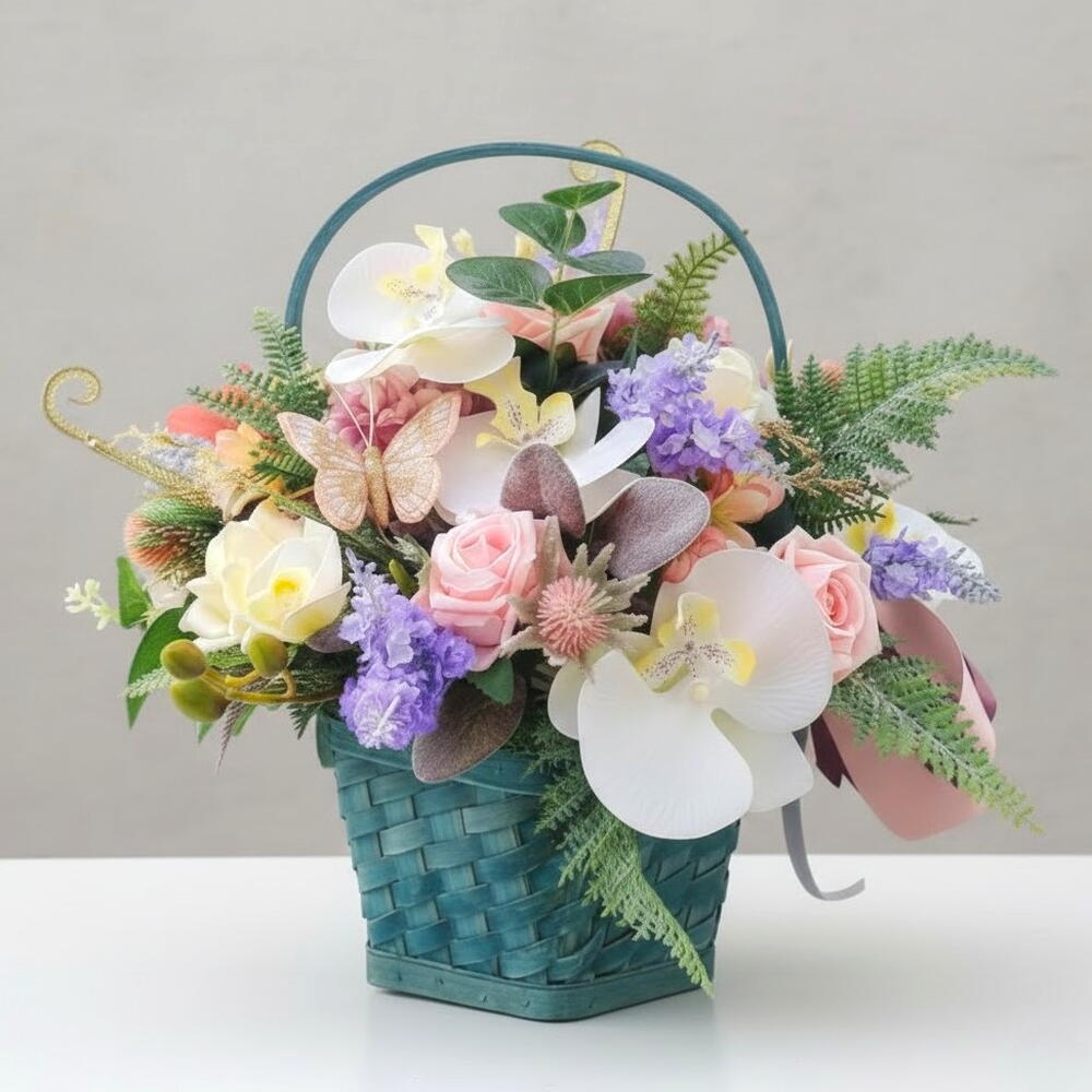 Этот красивый искусственный букет сочетает в себе нежные розовые розы, изящные белые орхидеи и фиолетовые цветы с пышной зеленью, создавая потрясающий и яркий образ. Цветы аккуратно расставлены в стильной бирюзовой плетеной корзине, украшенной капризным бабочкой, добавляющей очарование любому пространству. Сочетание реалистичных цветов, включая яркие розы и орхидеи, вместе с тонкой красотой папоротников и зелени создает приветливую и освежающую атмосферу. Этот букет идеально подходит для добавления изысканности в любой дом, офис или на мероприятие. Чтобы сохранить красоту букета, аккуратно протирайте его мягкой тканью или используйте сжатый воздух для очистки труднодоступных мест. Храните его вдали от прямых солнечных лучей, чтобы избежать выцветания и сохранить цвета яркими и долговечными.