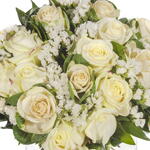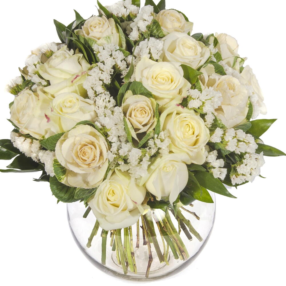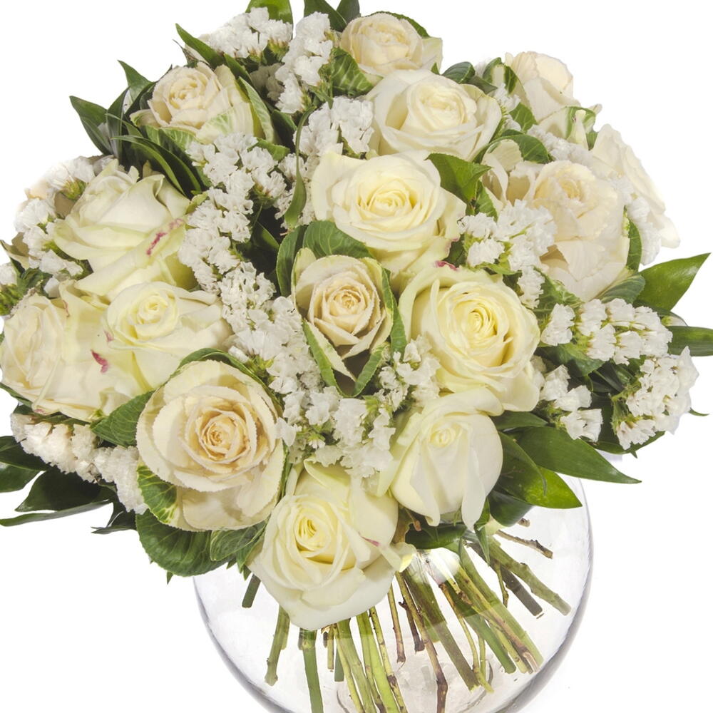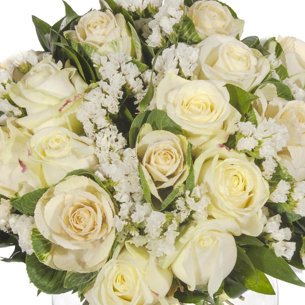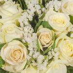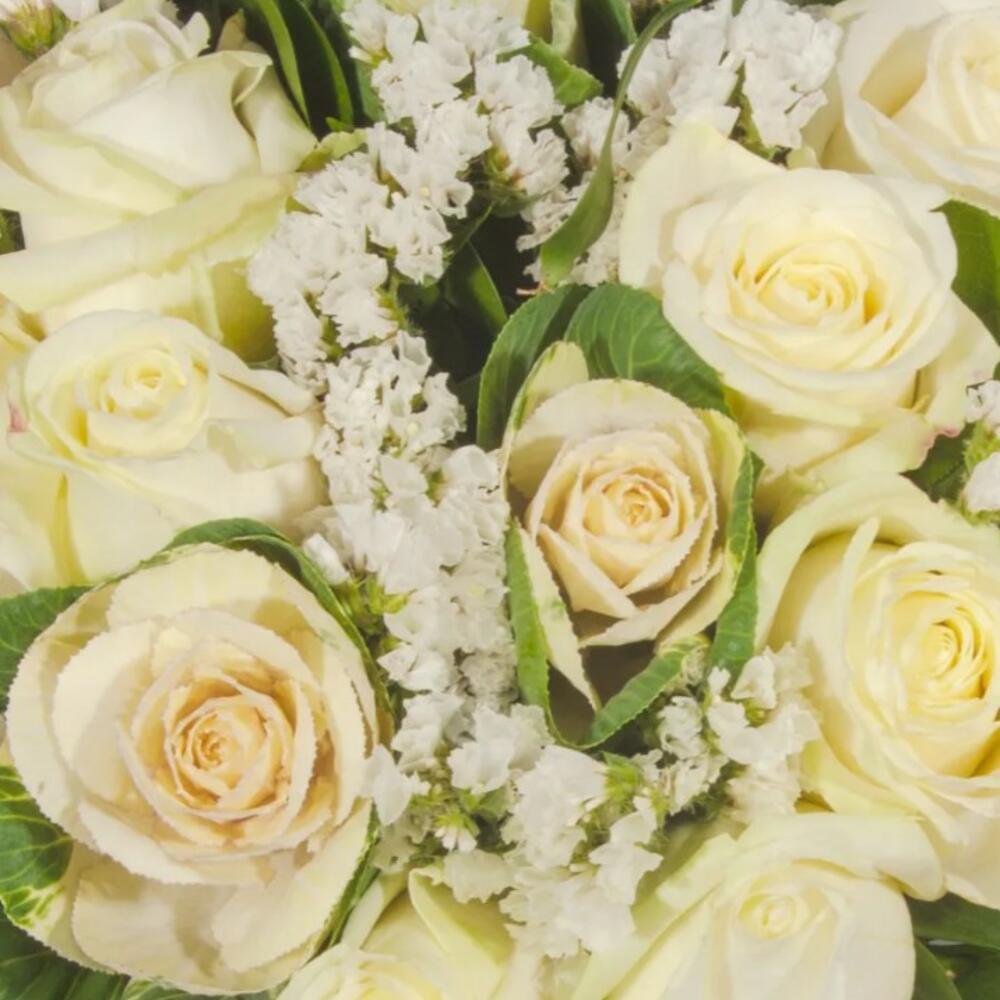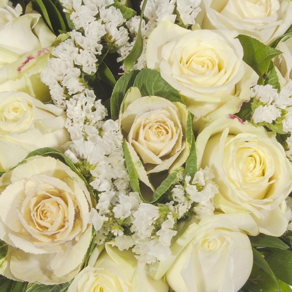 White rose - 9 шт. белый лимониум - 3 шт. сезонная листва - 7 шт. белая брассика - 9 шт.