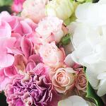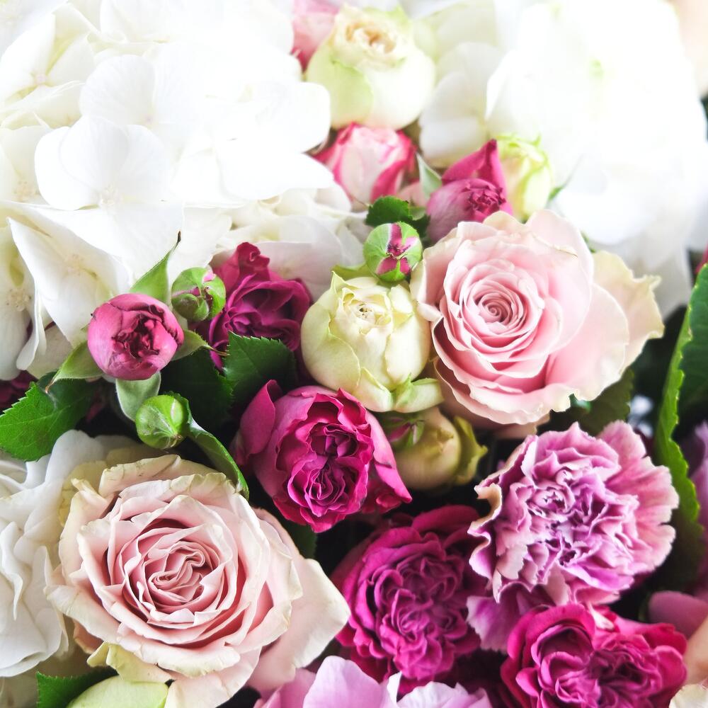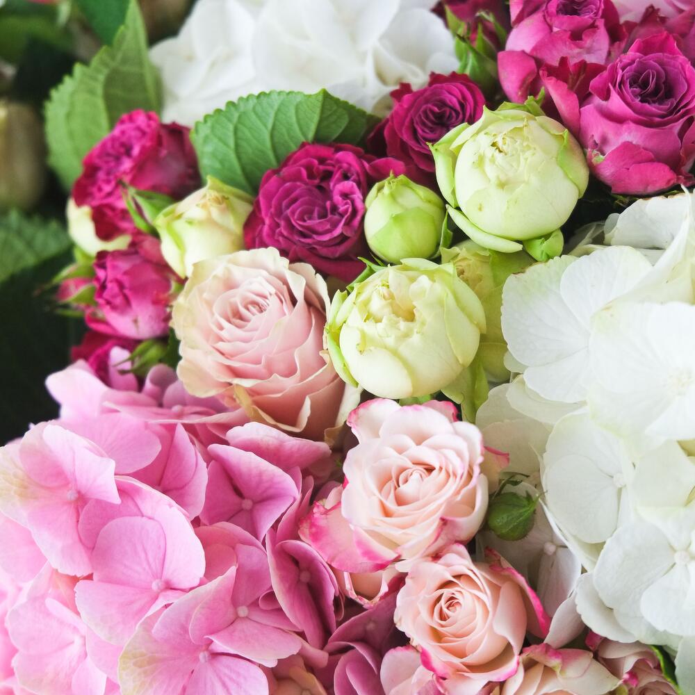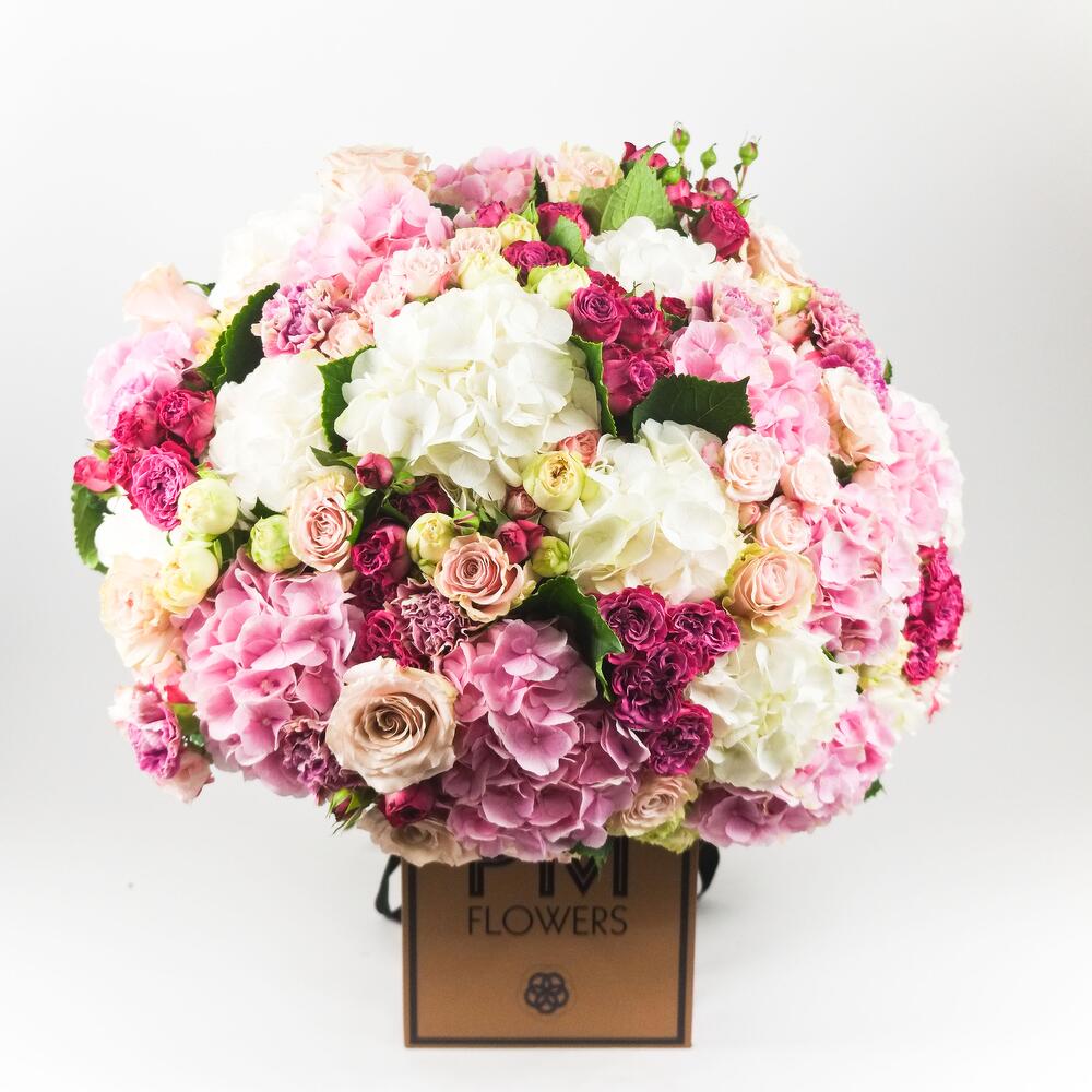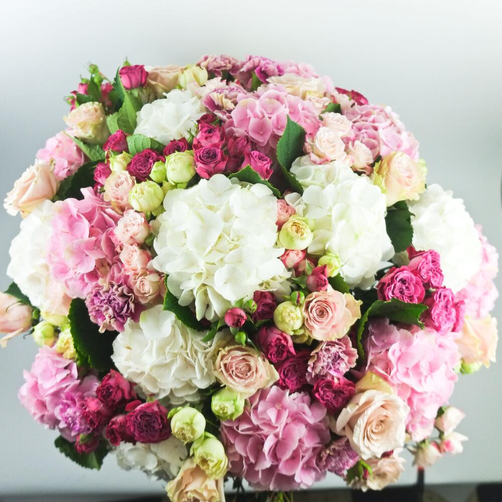 Захватывающий букет, который привлекает внимание. Очень большой по размеру, этот букет включает в себя белые и розовые гортензии, белые и фиолетовые бутонные розы, а также крупноголовые розы оттенков бледно-розового и песочного.