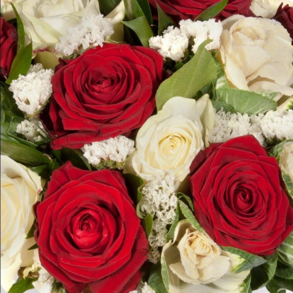 Limonium - 3 шт. White rose - 7 шт. naomi rose - 7 шт. роза из брассики - 5 шт. сезонная листва - 7 шт.