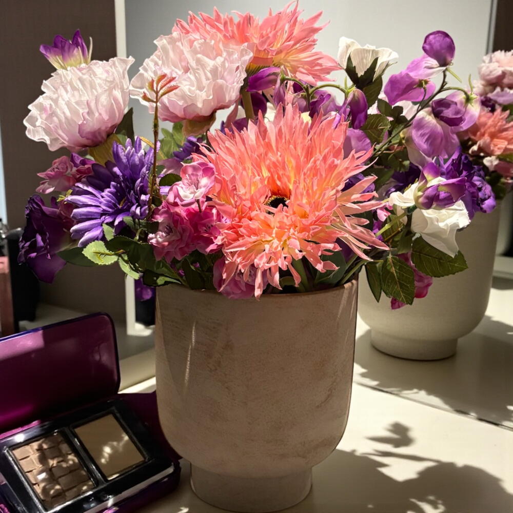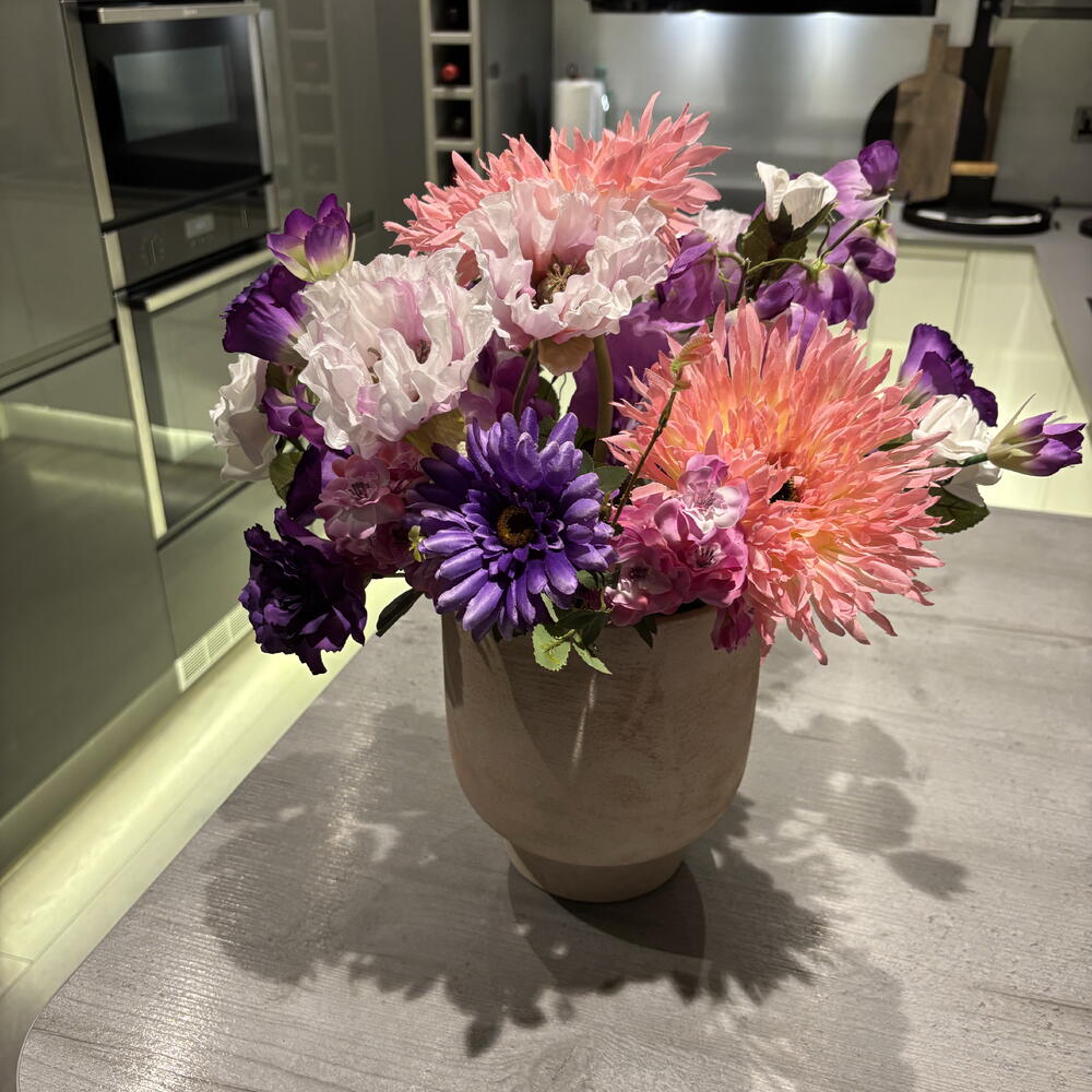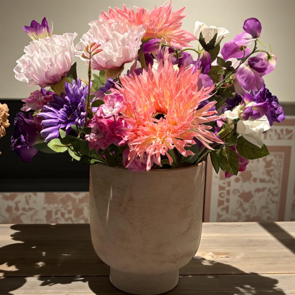 Яркая весенне-летняя композиция с фиолетовыми и нежно-розовыми герберами, дополненная персиковыми розами и нежным душистым горошком. Мягкие лизиантусы и sodtnpink маковый спрей переплетаются с богатым фиолетовым спреем роз, создавая глубину и движение. Радостная, но элегантная композиция, полная цвета, текстуры и вдохновляющего сезонного очарования для любого пространства. Ваза в комплекте. Высота:40см Ширина:40см