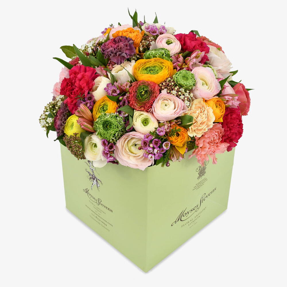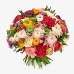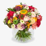 Красочная композиция из лучших сезонных цветов, созданная нашими опытными флористами. Погрузитесь в яркие оранжевые ранункулюсы, влюбитесь без памяти в наши ярко-розовые гвоздики и наслаждайтесь тонкой фактурой наших неотразимых альстромерий.