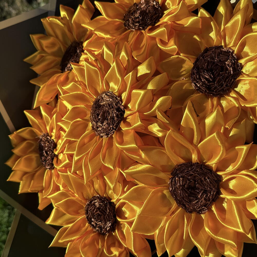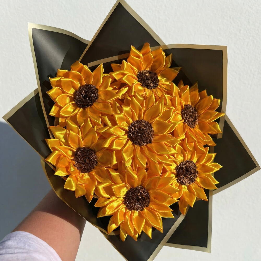 Принесите тепло солнечного света в каждый момент с нашим потрясающим букетом подсолнухов ручной работы из атласных лент. Каждый подсолнух тщательно изготовлен вручную из премиальной атласной ленты, создавая яркую, реалистичную композицию, которая никогда не увядает. Идеально как искренний подарок или как радостный элемент декора для вашего дома. ✨ Что внутри: 7 ярких жёлтых подсолнухов из ленты – с детализированными текстурированными серединками Упаковано в элегантную чёрно-золотую цветочную бумагу для смелого, современного акцента Завершено сочетающимся атласным бантом для законченного вида 💛 Почему вам это понравится: Ручная работа с любовью – каждый лепесток выполнен до совершенства Долговечный, не требующий ухода – не нужна вода, не вянет Лёгкий и удобный для размещения в любом месте Продуманный подарок на дни рождения, годовщины, новоселье или просто чтобы подарить кому‑то радость Доставляется точно так, как на фото, для гарантированной улыбки политика: возврат и возмещение не предусмотрены 🌟 Идеально для: удивления любимого человека, украшения вашего жилого пространства или в подарок друзьям, партнёрам, мужьям, жёнам, парням, девушкам и семье, которые заслуживают немного солнечного света в своей жизни.