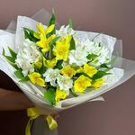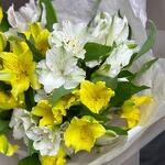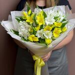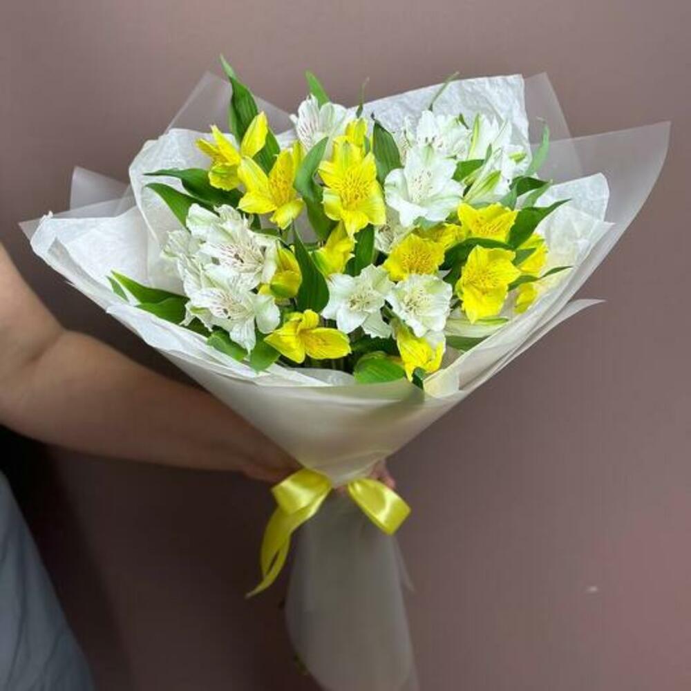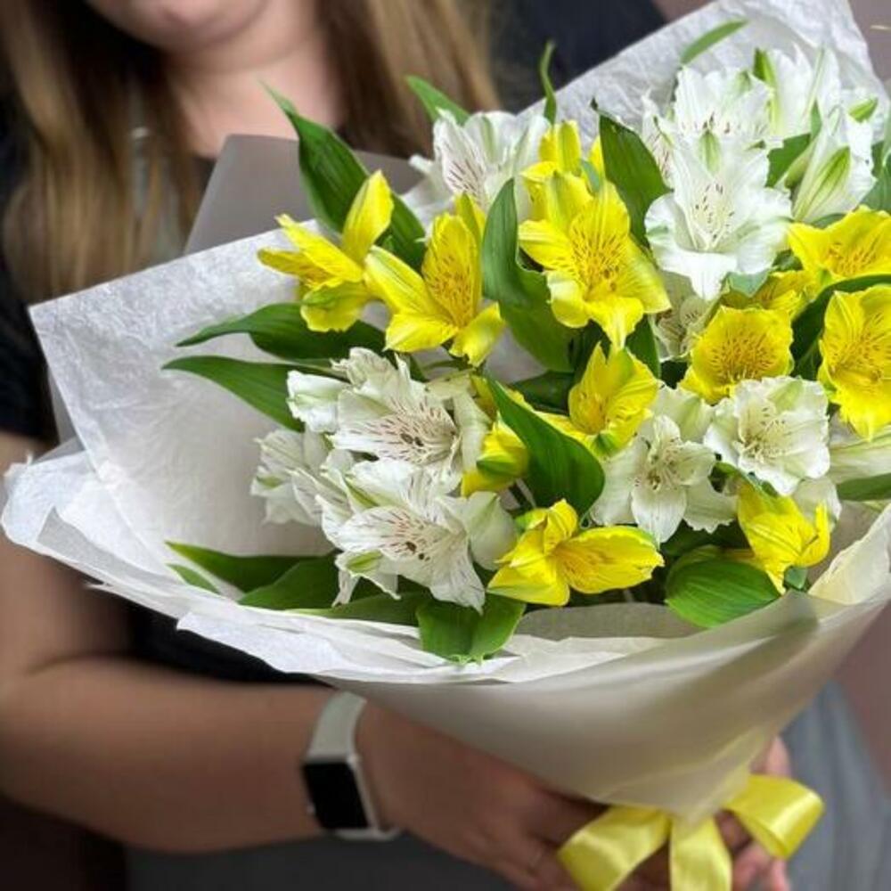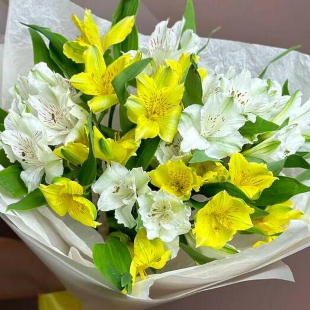 Наслаждайтесь теплом нашего букета из альстромерий, где нежные белые и яркие желтые альстромерии переплетаются в радостной симфонии цветов. Эта композиция излучает оптимизм и очарование, делая ее идеальным выбором, чтобы осветить чей-то день или отпраздновать особые моменты жизни.
