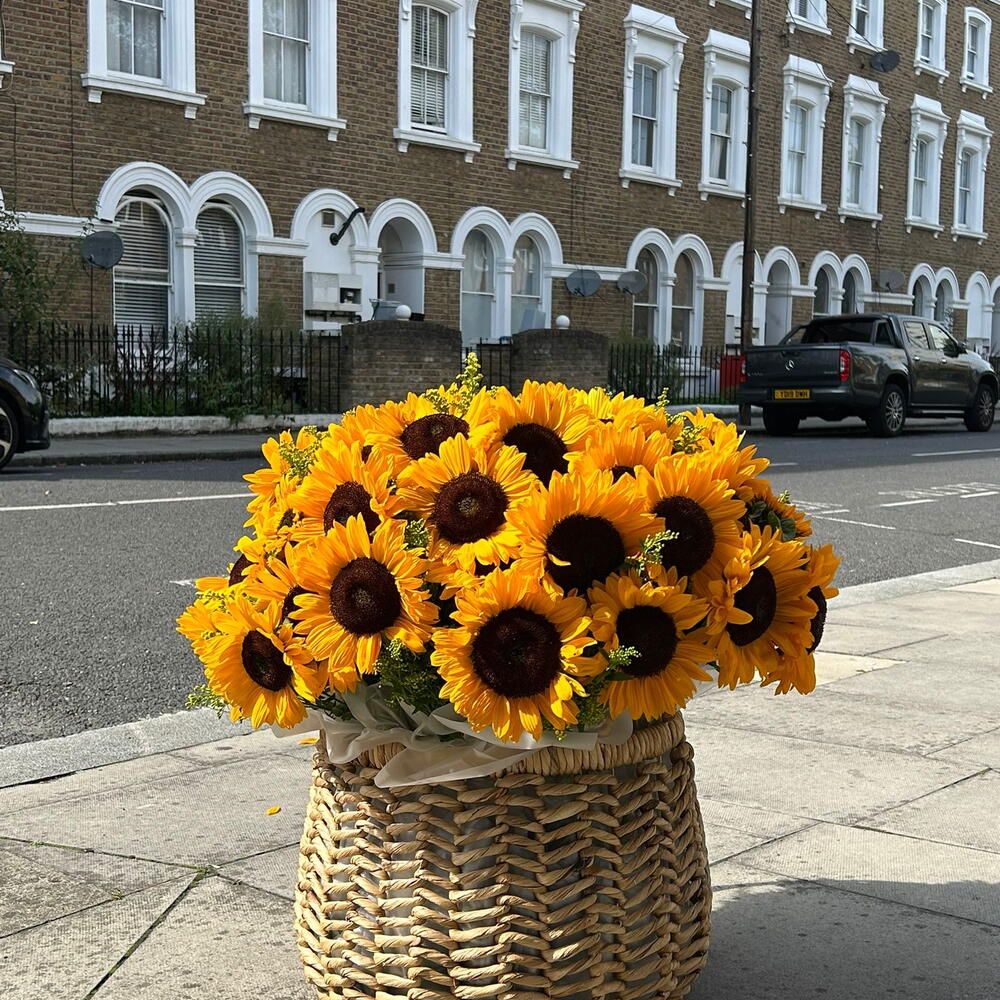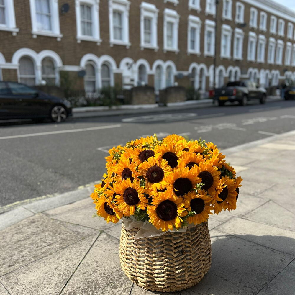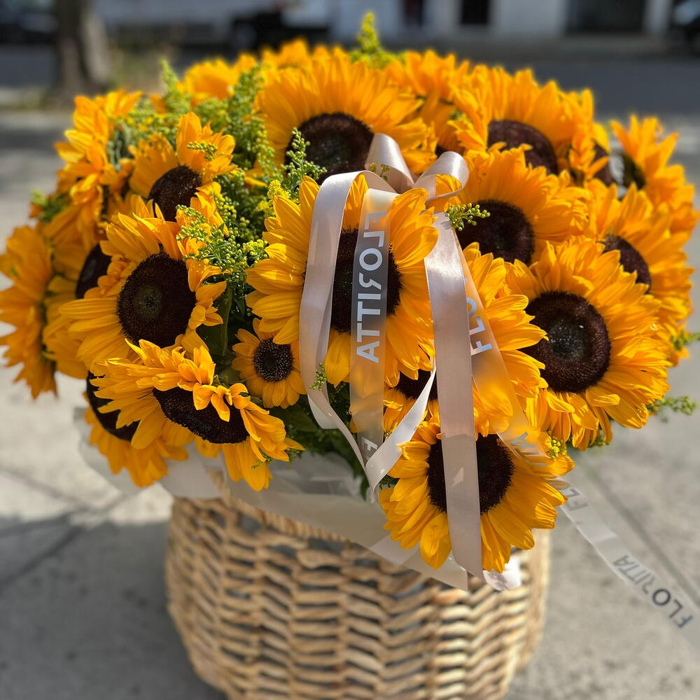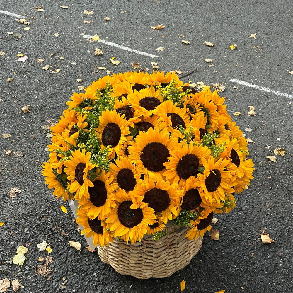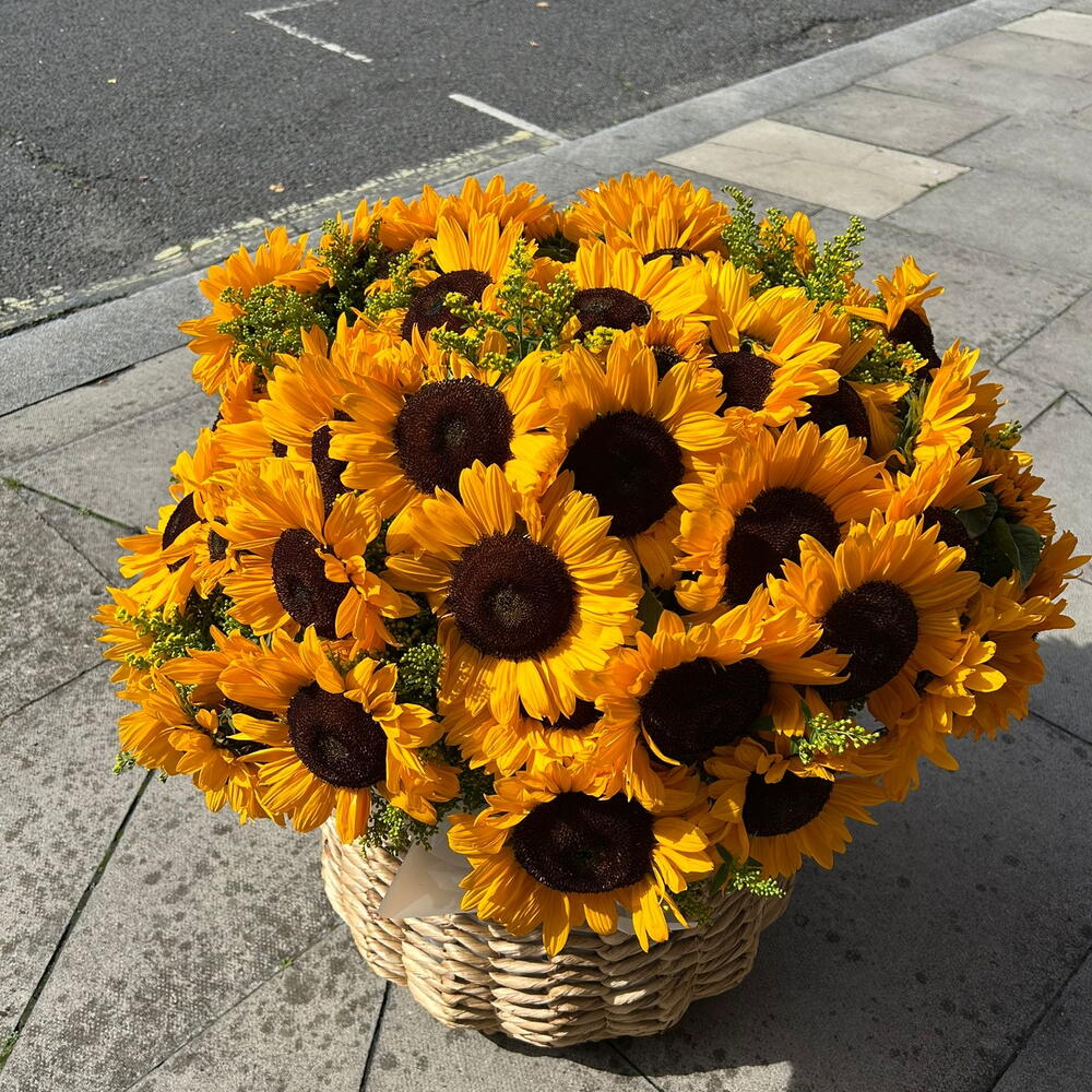 A large, bright basket filled with fresh sunflowers. This cheerful arrangement radiates warmth and positivity, bringing the beauty of summer into any setting. Perfect as a gift to uplift someone’s mood, decorate an event, or simply to add a vibrant touch of sunshine to the day.