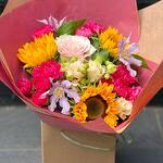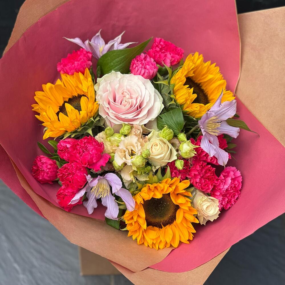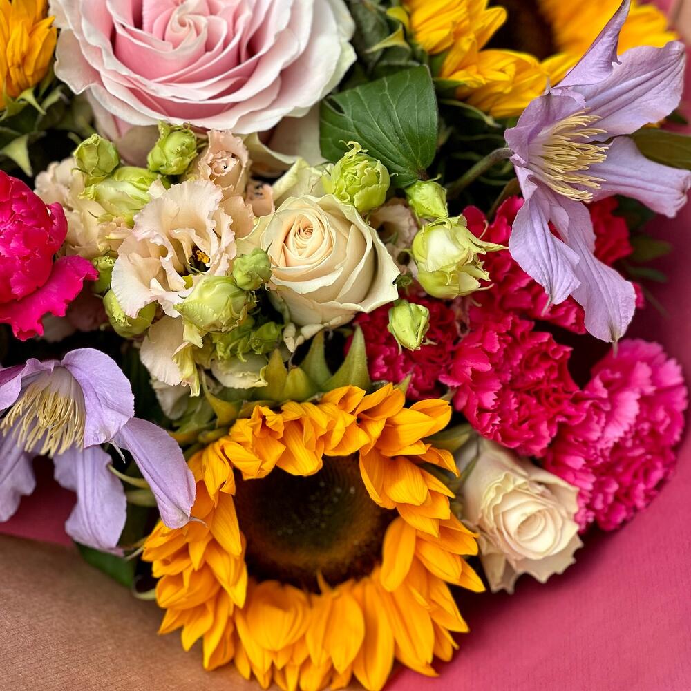 Sunflower - 3 шт. Clematis - 3 шт. Pink rose - 1 шт. packaging - 1 шт. pink carnation - 10 шт.