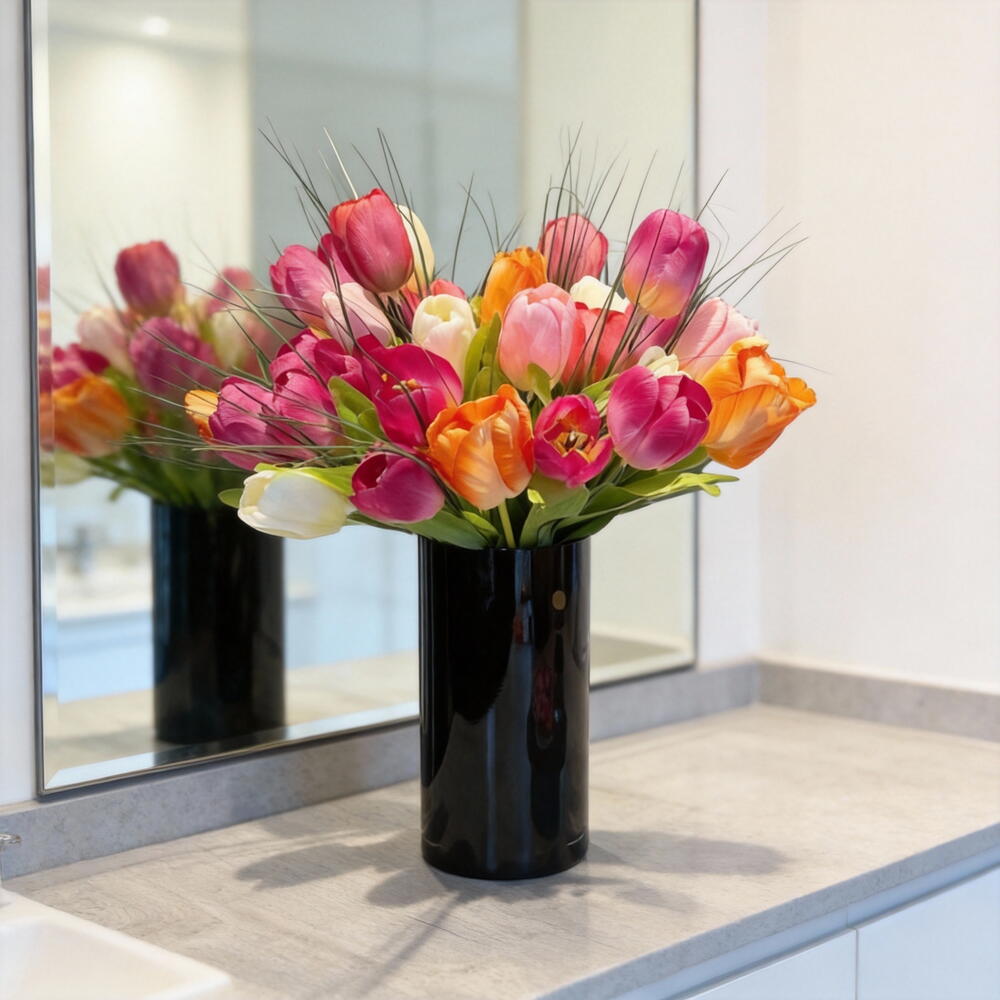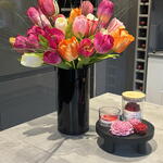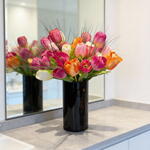 Радостный всплеск разноцветных тюльпанов в ярких оттенках розового, оранжевого и кремового, красиво оформленных со свежей зелёной листвой и прядями декоративной травы. Размещённая в элегантной чёрной вазе, эта искусственная композиция дарит мгновенную весеннюю энергию, тепло и воодушевляющие цвета любой комнате круглый год. Стиль вазы может варьироваться в зависимости от наличия, но мы обещаем, что она будет не менее красивой. Высота: 50 см Ширина: 46 см
