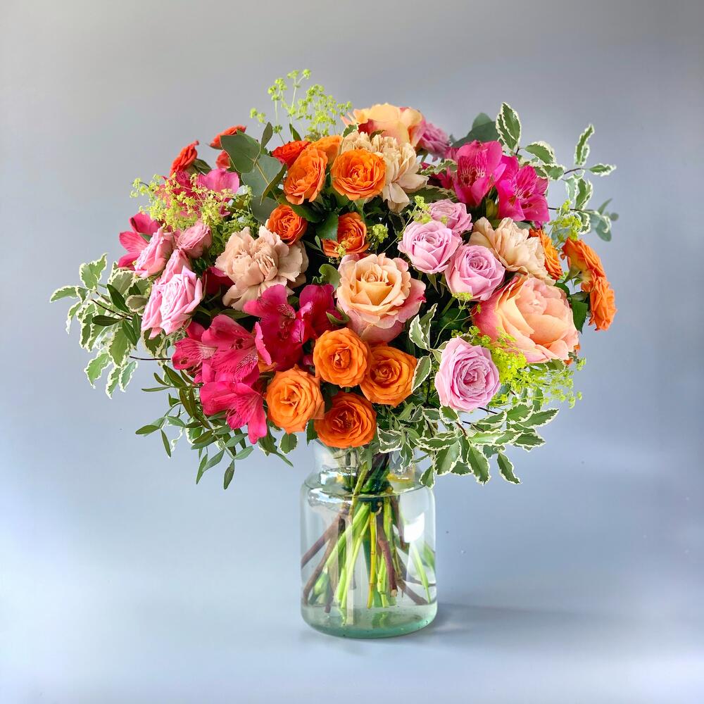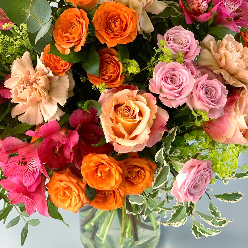 foliage - 25 шт. alchemilla mollis - 6 шт. персиковые розы - 4 шт. оранжевые спрей-розы - 5 шт. светло-розовые спрей-розы - 5 шт. розовые альстромерии - 5 шт. голые гвоздики - 6 шт.