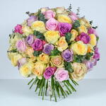 смешанные пастельные розы - 60 шт. пучок сезонной зелени - 1 шт.