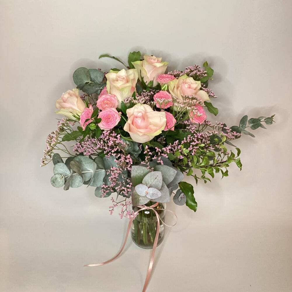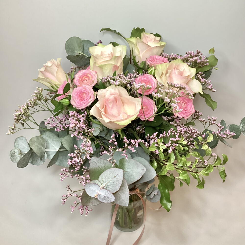 Spray rose - 2 шт. mixed foliage - 5 шт. розовый лимониум - 2 шт. пастельно-розовая роза - 5 шт. прозрачная ваза - 1 шт.