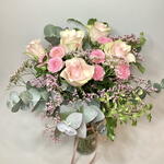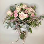Нежная, романтичная композиция из нежно-розовых и кустовых роз, лимониума и смеси зелени. В комплект входит прозрачная ваза высотой 16 см.
