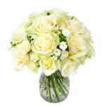white roses - 8 шт. белые спрей-розы - 6 шт. белый флокс - 7 шт. сезонная листва (пучок) - 1 шт.