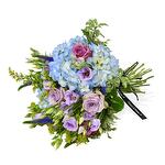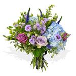 Solidago - 2 шт. blue hydrangea - 2 шт. purple lisianthus - 5 шт. фиолетовая вероника - 5 шт. фиолетовые розы - 5 шт. сезонная листва (пучок) - 1 шт.