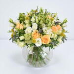 Лёгкие и воздушные оттенки собираются, чтобы создать этот потрясающий и нежный букет. Мечтательные персиковые розы сорта Аваланч в сочетании с белой гортензией создают сказочное настроение в букете этой недели. С яркими акцентами жёлтой креспедии и деликатно ароматной мяты, равномерно распределёнными по всей композиции. Всё оформлено сезонной зеленью, идеальный подарок для любого случая.