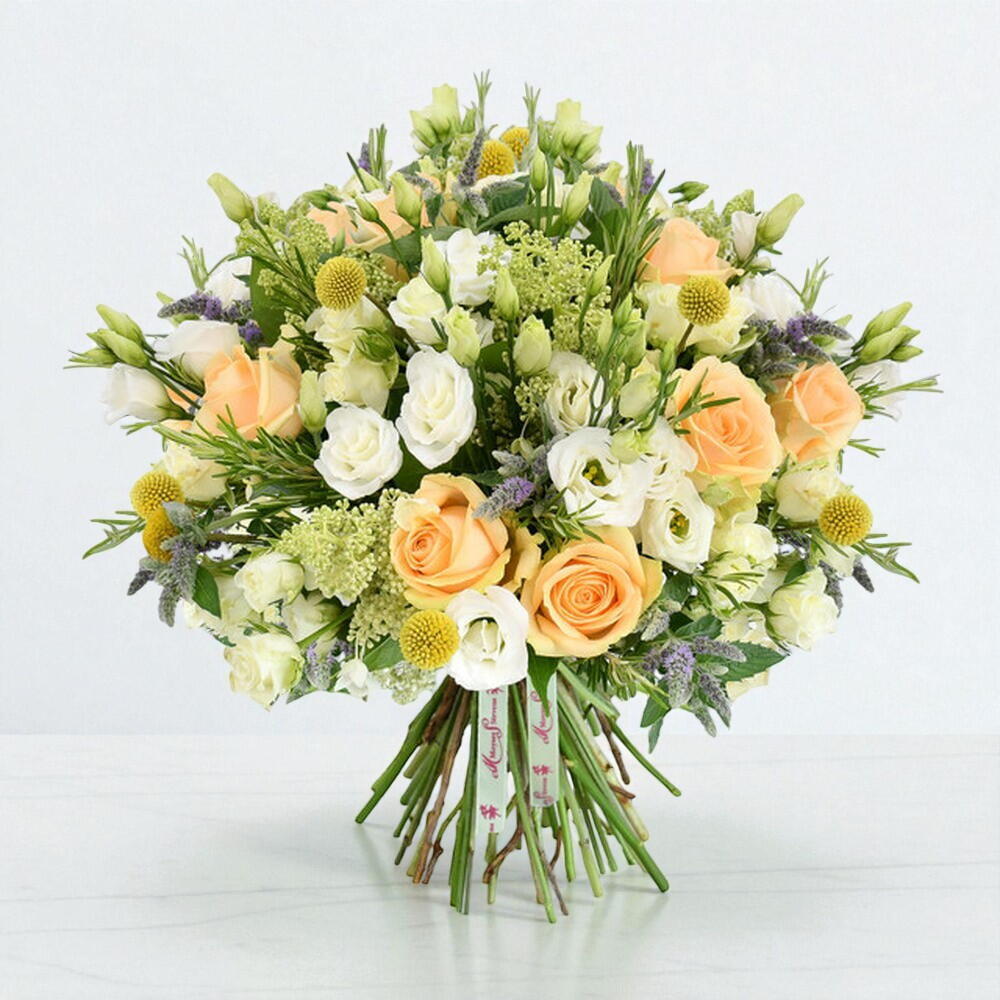 white lisianthus - 5 шт. желтая краспедия - 7 шт. персиковые розы - 5 шт. белые спрей-розы - 5 шт. сезонная зелень (букет) - 1 шт. фиолетовая мята - 7 шт. гортензия кюсю - 5 шт.