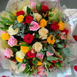 Потрясающий букет из 40 роз — розовых, белых, красных и жёлтых, красиво оформленный для яркой и радостной композиции. Эта яркая смесь воспевает любовь во всех её оттенках — идеально подходит для смелого, красочного сюрприза, который действительно выделяется.