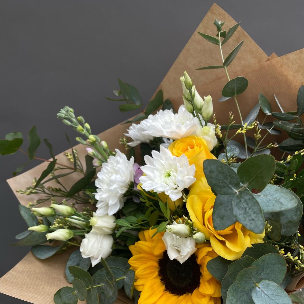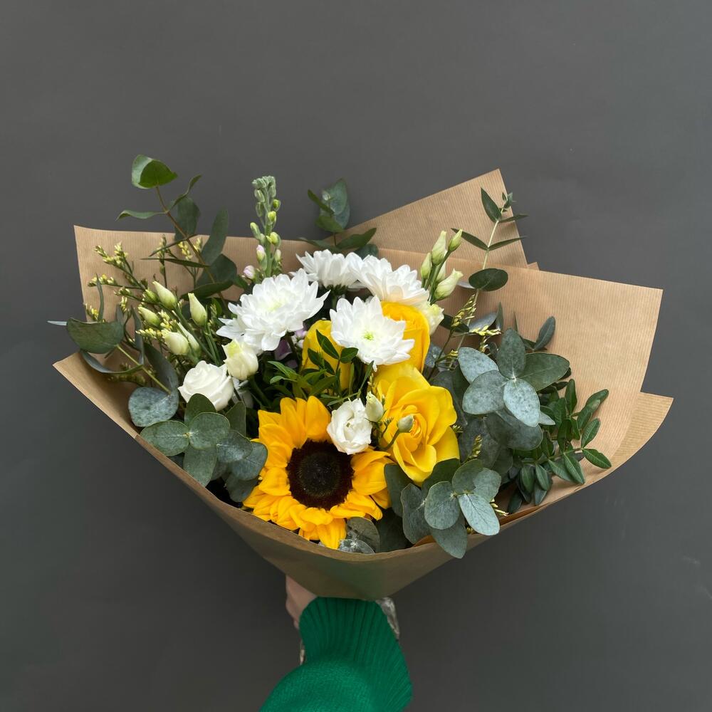 Greenery - 4 шт. Spray rose - 2 шт. Chrysanthemum - 1 шт. packaging - 1 шт. sunflower yellow - 1 шт. lissi - 1 шт.