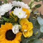 This summery bouquet will make you or your loved one feel amazing with its vibrant yellow sunflower and fragrant chrysanthemums and roses! Еach order comes with an aqua bag and flower food Please care for your flowers by cutting off stems with a sharp knife or scissors. By placing them in deep water prior to arranging in a clean container, having removed any foliage which would be below water level. Avoid putting flowers in direct sunlight, draughts or hot locations. Always use flower food provided.