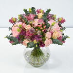 purple astrantia - 5 шт. pink lisianthus - 5 шт. pink hydrangea - 3 шт. розовый гиперикум - 5 шт. розовые восковые цветы - 5 шт. pink roses - 5 шт. розовые спрей-розы - 5 шт. сезонная зелень (букет) - 1 шт.