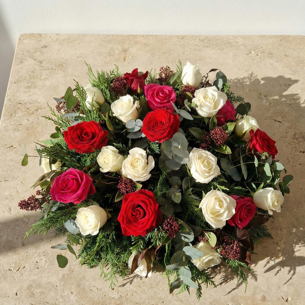 rose white - 20 шт. eucalyptus leaves - 8 шт. смесь листвы - 15 шт. роза красная и розовая - 12 шт. основа из флористической пены с поддоном - 1 шт.