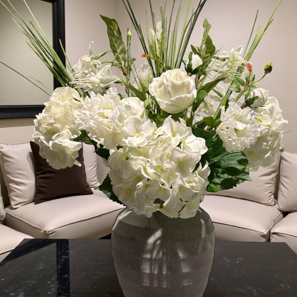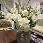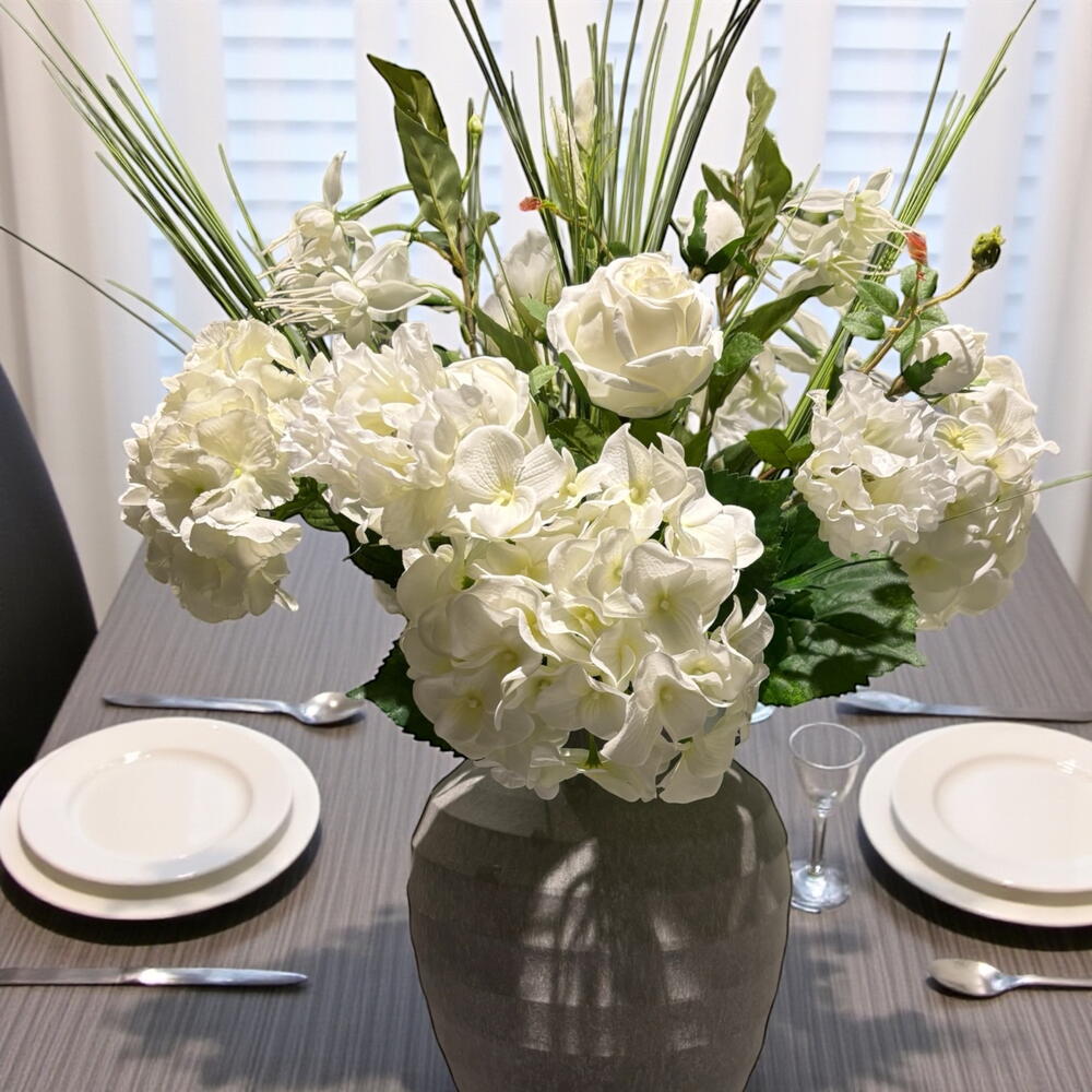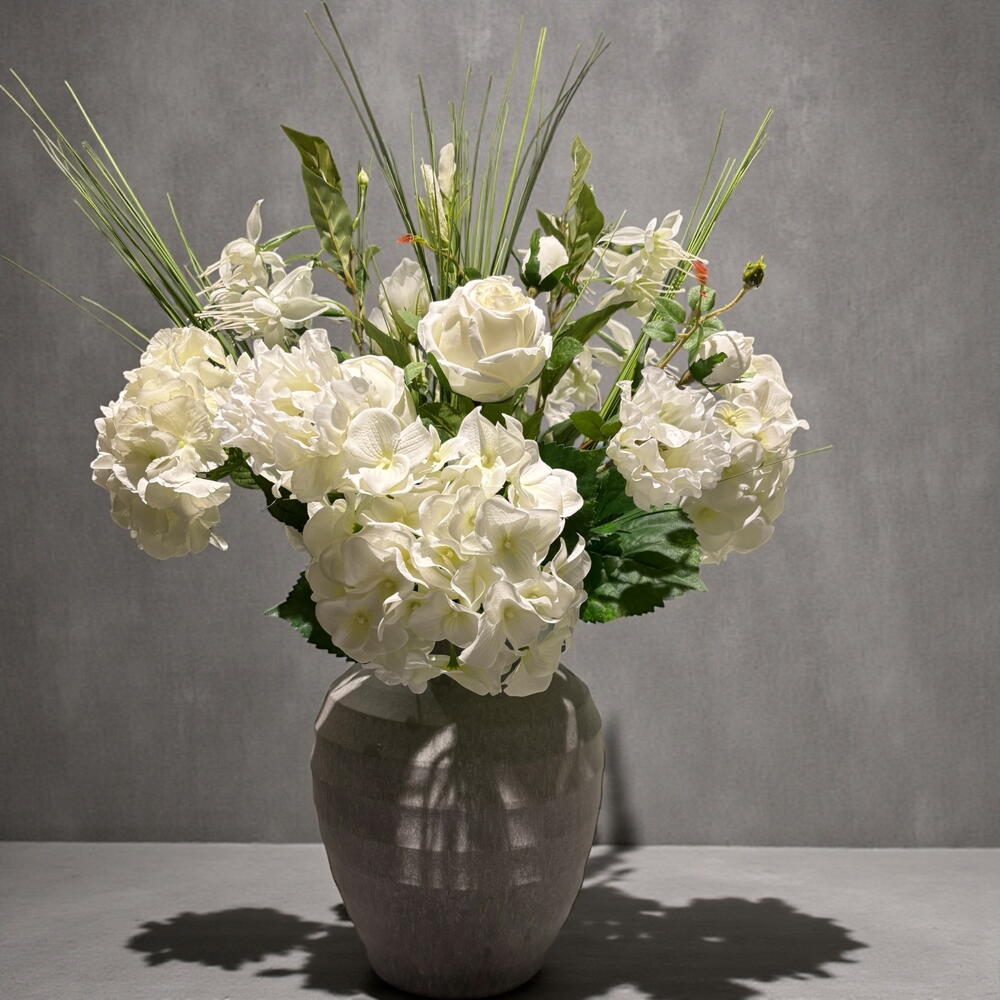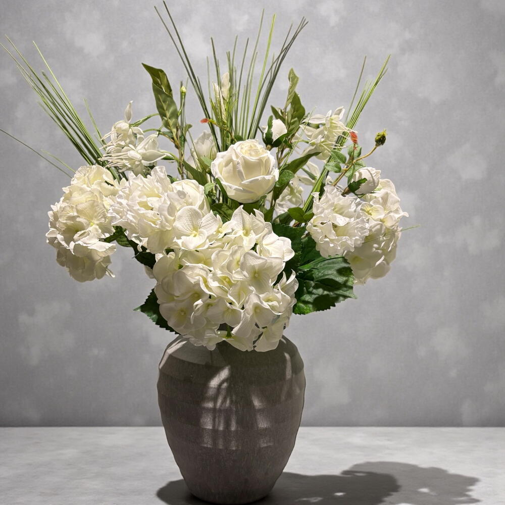 Мягко сформированная и прекрасно сбалансированная, эта элегантная композиция сочетает фуксиево-кремовые маки с облачными гортензиями цвета слоновой кости и нежным спреем лизиантуса. Спрей из чистых роз добавляет утонченную романтичность, а струящаяся медвежья трава придаёт высоту и движение. Вневременной искусственный дизайн, полный текстуры и грации, идеально подходит для украшения любого интерьера. Ваза в комплекте. Высота:69см Ширина:64см