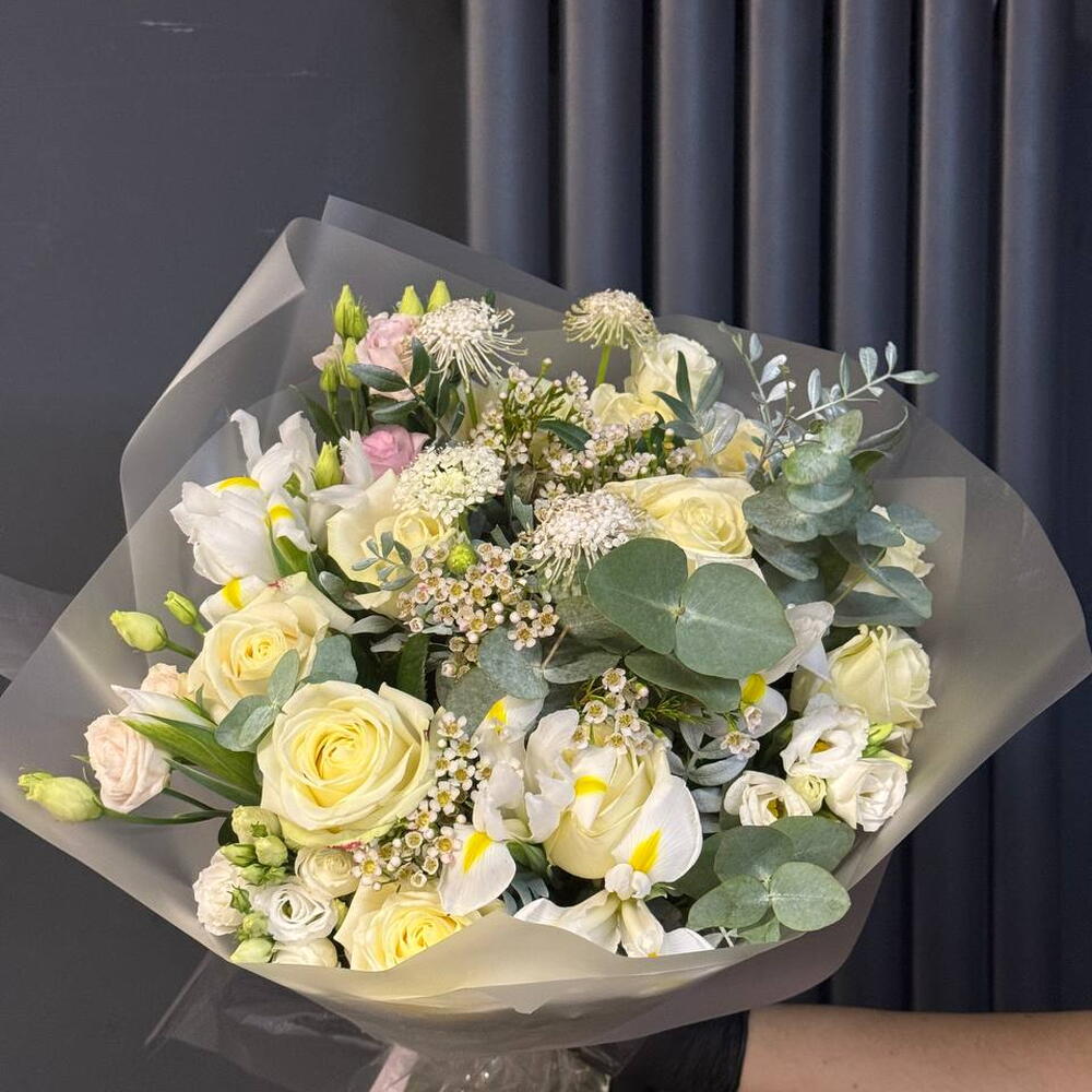 Eucalyptus - 5 шт. Solidago - 5 шт. white roses - 7 шт. white bush roses - 4 шт.