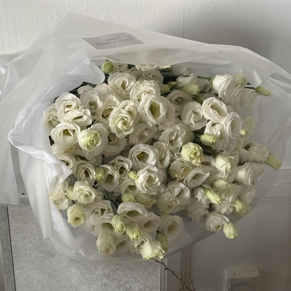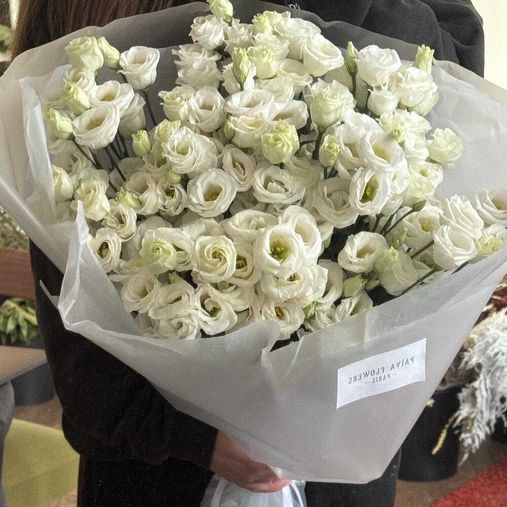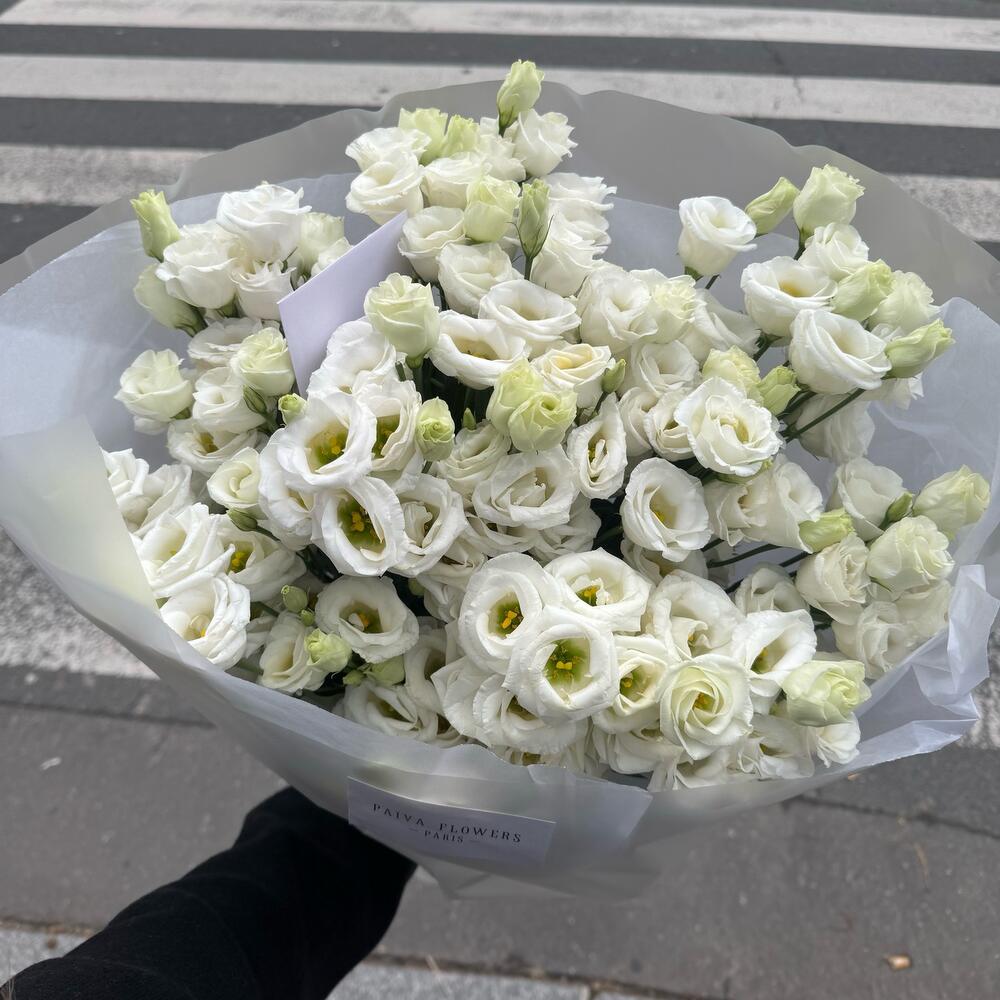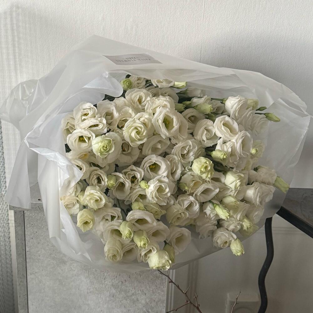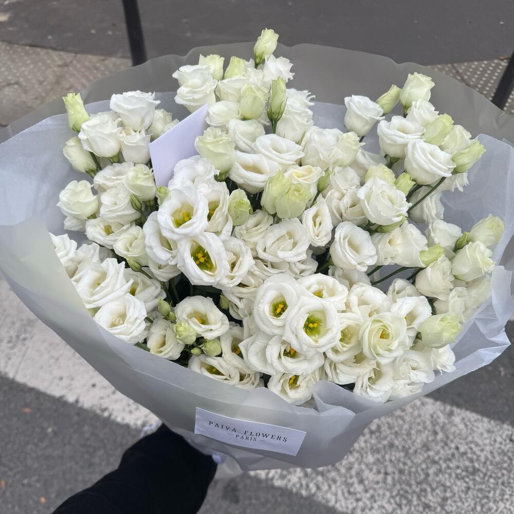 Lightness, tenderness, and sophistication in one bouquet. This elegant mono-bouquet of 11 white eustomas captivates with its sophistication. An enduring symbol of purity and tenderness, it makes a wonderful gift for any occasion. This bouquet will evoke a feeling of freshness and summer air, and can be given as a standalone gift or as an addition to a larger one. It makes the perfect decorative element and will evoke a cloud of unforgettable emotions. Make every day special with this unique bouquet of white eustomas.