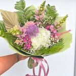 Букет "Выбор дикого флориста" - это захватывающая композиция, связанная вручную, созданная чтобы передать неукротимую красоту природы. Включает в себя 1 стебель пышной белой гортензии, 1 яркий фиолетовый аллиум, 3 стебля львиного зева, 2 стебля альстромерии, 2 веточки астильбы и сезонную листву с акцентами дымки. Этот букет сочетает в себе мягкие текстуры с яркими цветами. Естественное очарование усилено сухими листьями пальмы и слоями зелени, все это завернуто в премиальную светло-зеленую бумагу и перевязано атласной розовой лентой. Идеально подходит для дней рождения, праздников, в качестве благодарственного подарка или просто чтобы осветить чей-то день роскошными цветами. Инструкции по уходу Чтобы ваш букет "Выбор дикого флориста" оставался свежим подольше, сразу после получения поместите цветы в чистую вазу с прохладной свежей водой. Обрезайте стебли под углом каждые 2-3 дня для лучшего увлажнения. Регулярно обновляйте воду и держите букет в прохладном месте, подальше от прямых солнечных лучей, сквозняков и созревающих фруктов. Для лучших результатов избегайте переполнения вазы, позволяя каждому цветку полностью и красиво раскрыться.